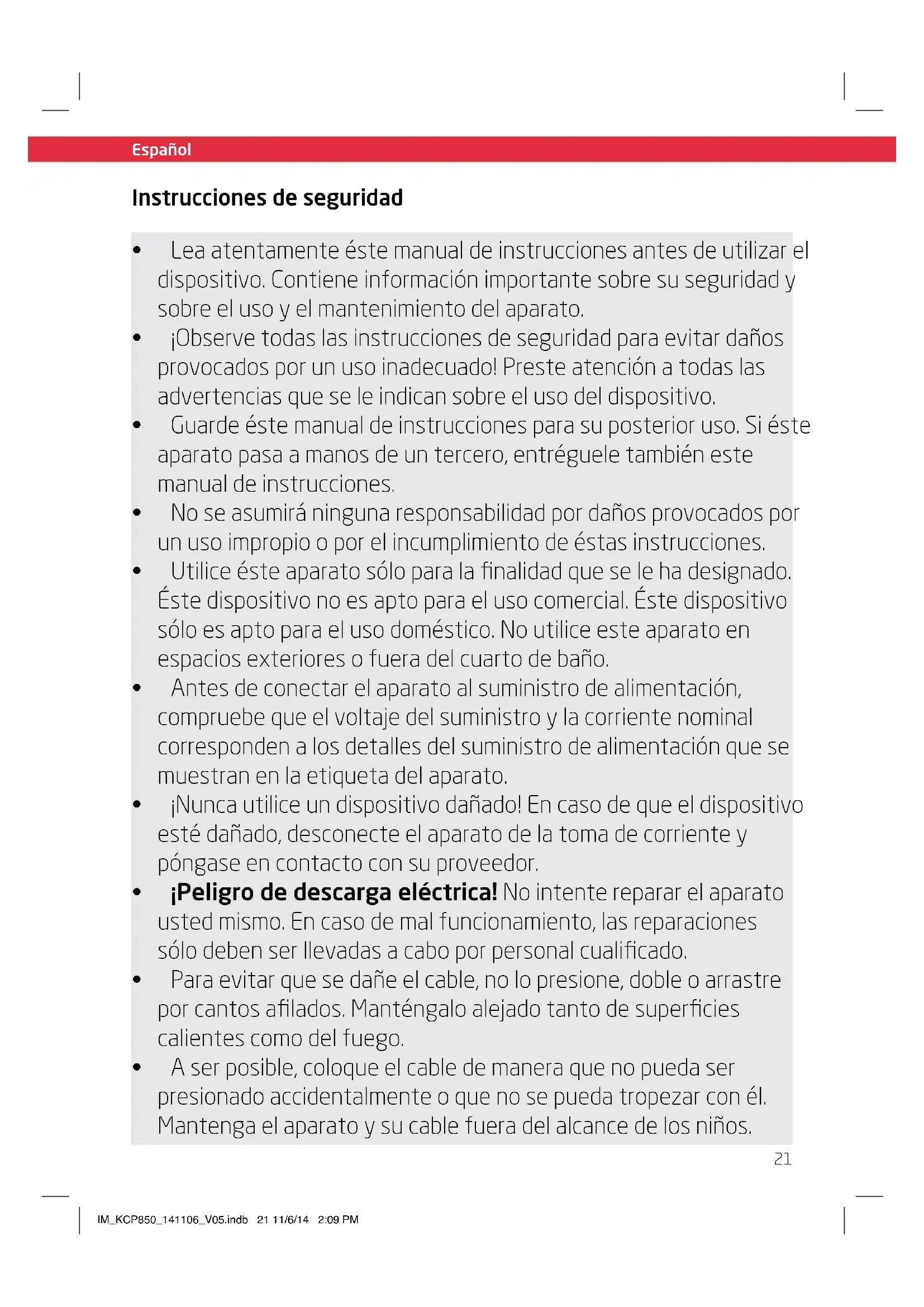 - Aserposible,coloqueelcabledemaneraquenopuedaser presionadoaccidentalmenteoquenosepuedatropezarconél. Mantengaelaparatoysucablefueradelalcancedelosniños. Instrucciones de seguridad IM_KCP850_141106_V05.indb 21 11/6/14 2:09 PM22 Español Español