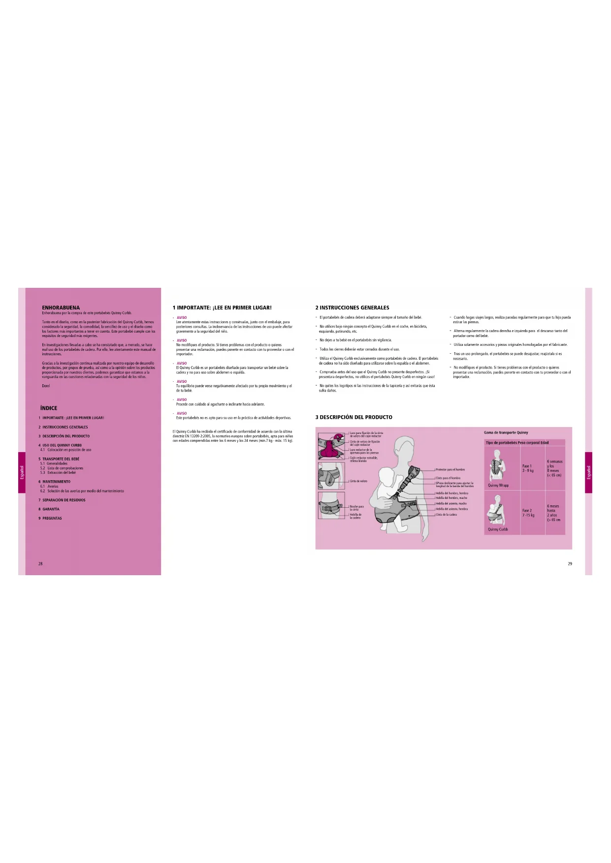 8 GARANTÍA 9 PREGUNTAS 1 IMPORTANTE: ¡LEE EN PRIMER LUGAR! - AVISO Lee atentamente estas instrucciones y consérvalas, junto con el embalaje, para posteriores consultas. La inobservancia de las instrucciones de uso puede afectar gravemente a la seguridad del niño. - AVISO No modifiques el producto. Si tienes problemas con el producto o quieres presentar una reclamación, puedes ponerte en contacto con tu proveedor o con el importador. - AVISO El Quinny Curbb es un portabebés diseñado para transportar un bebé sobre la cadera y no para uso sobre abdomen o espalda. - AVISO Tu equilibrio puede verse negativamente afectado por tu propio movimiento y el de tu bebé. - AVISO Procede con cuidado al agacharte o inclinarte hacia adelante. - AVISO Este portabebés no es apto para su uso en la práctica de actividades deportivas. El Quinny Curbb ha recibido el certificado de conformidad de acuerdo con la última directriz EN 13209-2:2005, la normativa europea sobre portabebés, apta para niños con edades comprendidas entre los 6 meses y los 24 meses (min.7 kg - máx. 15 kg).