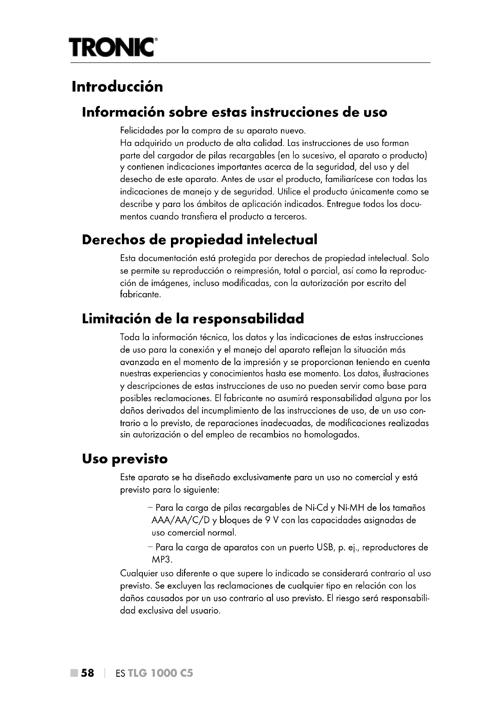 Introducción Información sobre estas instrucciones de uso Felicidades por la compra de su aparato nuevo. Ha adquirido un producto de alta calidad. Las instrucciones de uso forman parte del cargador de pilas recargables (en lo sucesivo, el aparato o producto) y contienen indicaciones importantes acerca de la seguridad, del uso y del desecho de este aparato. Antes de usar el producto, familiarícese con todas las indicaciones de manejo y de seguridad. Utilice el producto únicamente como se describe y para los ámbitos de aplicación indicados. Entregue todos los docu- mentos cuando transfiera el producto a terceros. Derechos de propiedad intelectual Esta documentación está protegida por derechos de propiedad intelectual. Solo se permite su reproducción o reimpresión, total o parcial, así como la reproduc- ción de imágenes, incluso modificadas, con la autorización por escrito del fabricante. Limitación de la responsabilidad Toda la información técnica, los datos y las indicaciones de estas instrucciones de uso para la conexión y el manejo del aparato reflejan la situación más avanzada en el momento de la impresión y se proporcionan teniendo en cuenta nuestras experiencias y conocimientos hasta ese momento. Los datos, ilustraciones y descripciones de estas instrucciones de uso no pueden servir como base para posibles reclamaciones. El fabricante no asumirá responsabilidad alguna por los daños derivados del incumplimiento de las instrucciones de uso, de un uso con- trario a lo previsto, de reparaciones inadecuadas, de modificaciones realizadas sin autorización o del empleo de recambios no homologados. Uso previsto Este aparato se ha diseñado exclusivamente para un uso no comercial y está previsto para lo siguiente: − Para la carga de pilas recargables de Ni-Cd y Ni-MH de los tamaños AAA/AA/C/D y bloques de 9V con las capacidades asignadas de uso comercial normal. − Para la carga de aparatos con un puerto USB, p. ej., reproductores de MP3. Cualquier uso diferente o que supere lo indicado se considerará contrario al uso previsto. Se excluyen las reclamaciones de cualquier tipo en relación con los daños causados por un uso contrario al uso previsto. El riesgo será responsabili- dad exclusiva del usuario.ES
