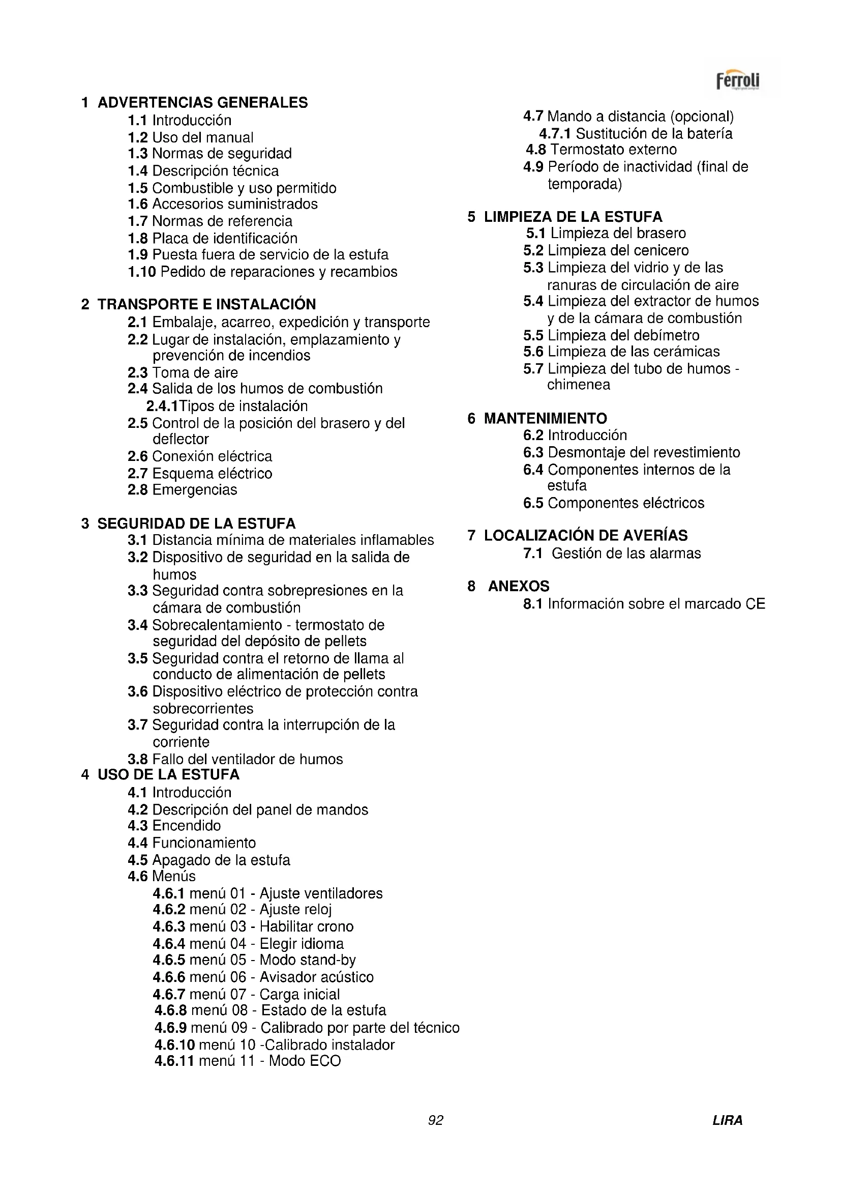 - Leer este manual antes de realizar operaciones de instalación, uso y mantenimiento de la estufa. - Hacer realizar la instalación, la conexión eléctrica, la prueba y el mantenimiento por un técnico autorizado. - Conectar la estufa a una chimenea según normas a través de un terminal inspeccionable. La conexión de varios aparatos a una misma chimenea debe estar autorizada por las normas locales y por el organismo de control de este tipo de sistemas. - Conectar la estufa a la aspiración mediante un tubo o toma de aire desde el exterior. - Conectar la estufa a una toma de corriente homologada de 230 V - 50 Hz. - Controlar que la instalación eléctrica y las tomas de corriente tengan capacidad para soportar la absorción máxima del equipo, indicada en la placa y en este manual. - Antes de hacer cualquier operación de mantenimiento, desconectar la estufa de la corriente eléctrica y dejar que se enfríe. - No utilizar líquidos o sustancias inflamables para encender la estufa o reavivar la llama: con la estufa en marcha, los pellets se encienden automáticamente. - Alimentar la estufa exclusivamente con pellets de madera que tengan las características descritas en este manual. - No utilizar la estufa como incinerador de residuos. - No cerrar en ningún caso las entradas de aire comburente ni las salidas de humos. - No manipular sustancias fácilmente inflamables o explosivas cerca de la estufa encendida. - No quitar ni modificar la rejilla de protección del depósito de pellets ni otros dispositivos de seguridad. - No utilizar la estufa con la puerta de la cámara de combustión abierta o con el vidrio rajado o roto. - Durante el funcionamiento, el intenso calor generado por la combustión de los pellets calienta las superficies externas de la estufa, en particular, la puerta de la cámara, la manija y el tubo de salida de humos. Evitar el contacto con dichas partes sin una protección adecuada. - Mantener a una distancia prudencial los objetos inflamables o que no resistan al calor. - Limpiar correctamente el brasero a cada encendido o recarga de pellets. - Hacer limpiar el conducto y los deflectores de humo, dentro de la cámara de combustión, por un técnico autorizado. - Evitar la formación de humo y de material inquemado durante el encendido y el funcionamiento. Si se acumula mucho pellet sin quemar en el brasero, quitarlo manualmente antes del próximo encendido. - Advertir a los niños y huéspedes de los peligros anteriormente descritos. - En caso de anomalías de funcionamiento, no reencender la estufa hasta que se haya resuelto la causa del problema. - Las modificaciones de la estufa o el uso de recambios no originales sin la debida autorización pueden poner al usuario en peligro, ante lo cual el fabricante queda exento de responsabilidad civil o penal. - Utilizar solo recambios originales indicados por el fabricante. El fabricante no asume ninguna responsabilidad por inconvenientes, roturas o accidentes debidos a la inobservancia de las indicaciones dadas en el presente manual.94 LIRA