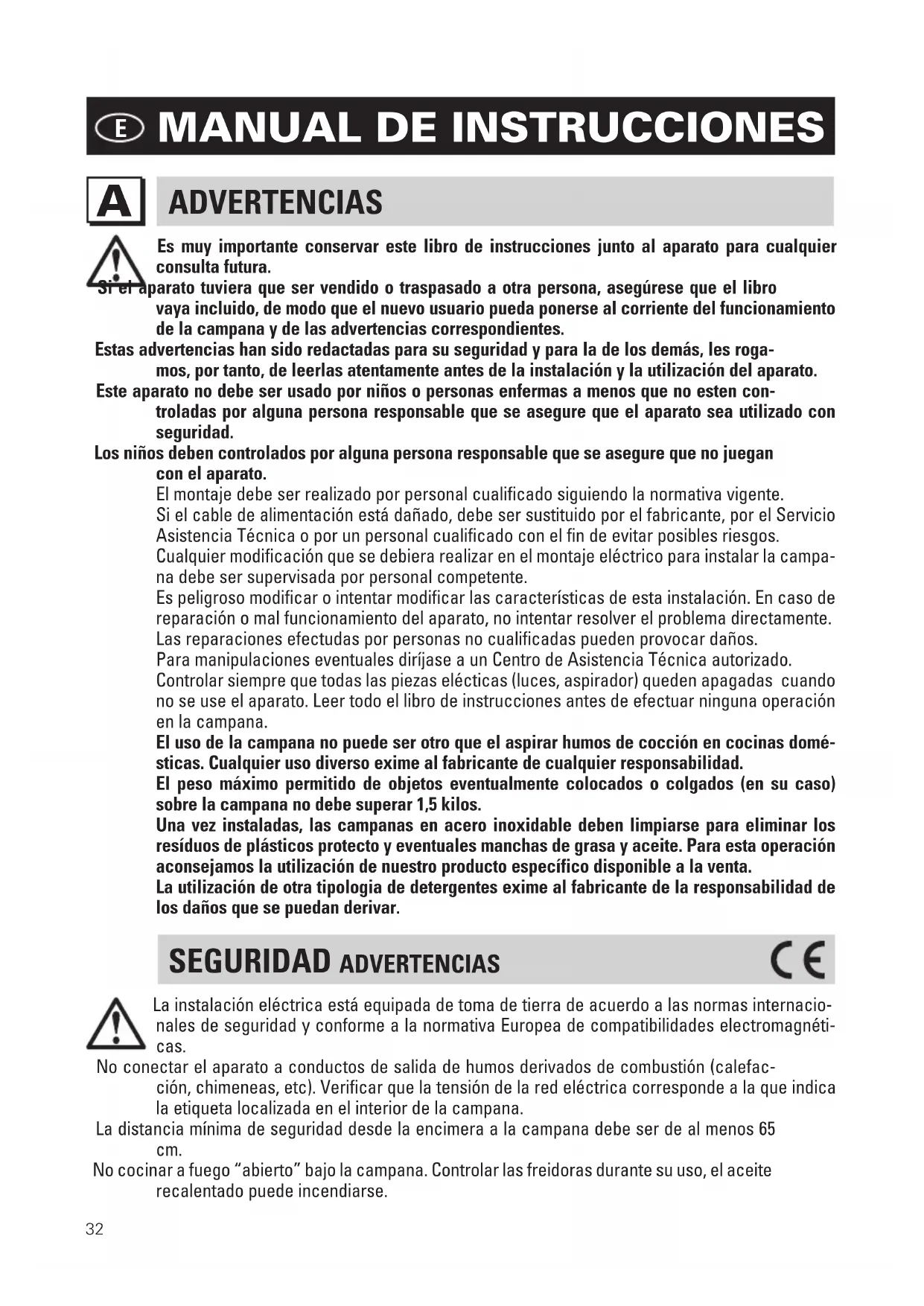 Es muy importante conservar este libro de instrucciones junto al aparato para cualquier consulta futura. Si el aparato tuviera que ser vendido o traspasado a otra persona, asegúrese que el libro vaya incluido, de modo que el nuevo usuario pueda ponerse al corriente del funcionamiento de la campana y de las advertencias correspondientes. Estas advertencias han sido redactadas para su seguridad y para la de los demás, les roga- mos, por tanto, de leerlas atentamente antes de la instalación y la utilización del aparato. Este aparato no debe ser usado por niños o personas enfermas a menos que no esten con- troladas por alguna persona responsable que se asegure que el aparato sea utilizado con seguridad. Los niños deben controlados por alguna persona responsable que se asegure que no juegan con el aparato. El montaje debe ser realizado por personal cualificado siguiendo la normativa vigente. Si el cable de alimentación está dañado, debe ser sustituido por el fabricante, por el Servicio Asistencia Técnica o por un personal cualificado con el fin de evitar posibles riesgos. Cualquier modificación que se debiera realizar en el montaje eléctrico para instalar la campa- na debe ser supervisada por personal competente. Es peligroso modificar o intentar modificar las características de esta instalación. En caso de reparación o mal funcionamiento del aparato, no intentar resolver el problema directamente. Las reparaciones efectudas por personas no cualificadas pueden provocar daños. Para manipulaciones eventuales diríjase a un Centro de Asistencia Técnica autorizado. Controlar siempre que todas las piezas elécticas (luces, aspirador) queden apagadas cuando no se use el aparato. Leer todo el libro de instrucciones antes de efectuar ninguna operación en la campana. El uso de la campana no puede ser otro que el aspirar humos de cocción en cocinas domé- sticas. Cualquier uso diverso exime al fabricante de cualquier responsabilidad. El peso máximo permitido de objetos eventualmente colocados o colgados (en su caso) sobre la campana no debe superar 1,5 kilos. Una vez instaladas, las campanas en acero inoxidable deben limpiarse para eliminar los resíduos de plásticos protecto y eventuales manchas de grasa y aceite. Para esta operación aconsejamos la utilización de nuestro producto específico disponible a la venta. La utilización de otra tipologia de detergentes exime al fabricante de la responsabilidad de los daños que se puedan derivar. SEGURIDAD ADVERTENCIAS La instalación eléctrica está equipada de toma de tierra de acuerdo a las normas internacio- nales de seguridad y conforme a la normativa Europea de compatibilidades electromagnéti- cas. No conectar el aparato a conductos de salida de humos derivados de combustión (calefac- ción, chimeneas, etc). Verificar que la tensión de la red eléctrica corresponde a la que indica la etiqueta localizada en el interior de la campana. La distancia mínima de seguridad desde la encimera a la campana debe ser de al menos 65 cm. No cocinar a fuego “abierto” bajo la campana. Controlar las freidoras durante su uso, el aceite recalentado puede incendiarse.33 - Asegurarse que haya una ventilación adecuada en la estancia si la campana se utiliza junto con otros aparatos que usan combustión a gas u otros. - No encender fuego abierto bajo la campana. - No conectar el aparato a conductos de salida de humos derivados de la combustión (cale- facciones, chimeneas, etc). - Asegúrese que se cumple la normativa vigente sobre salida de humos al exterior del local antes del uso de la campana. Antes de proceder a cualquier operación de limpieza o manutención, apagar el aparato desenchufándolo o accionando el interruptor general. El fabricante declina cualquier re- sponsabilidad por eventuales daños que pudieran, directa o indirectamente, ser causados a personas, cosas o animales domésticos derivados de la omisión de las prescripciones indicadas en el libro de instrucciones adjunto y concernientes especialmente, a las indica- ciones en tema de instalación, uso y mantenimiento del aparato.