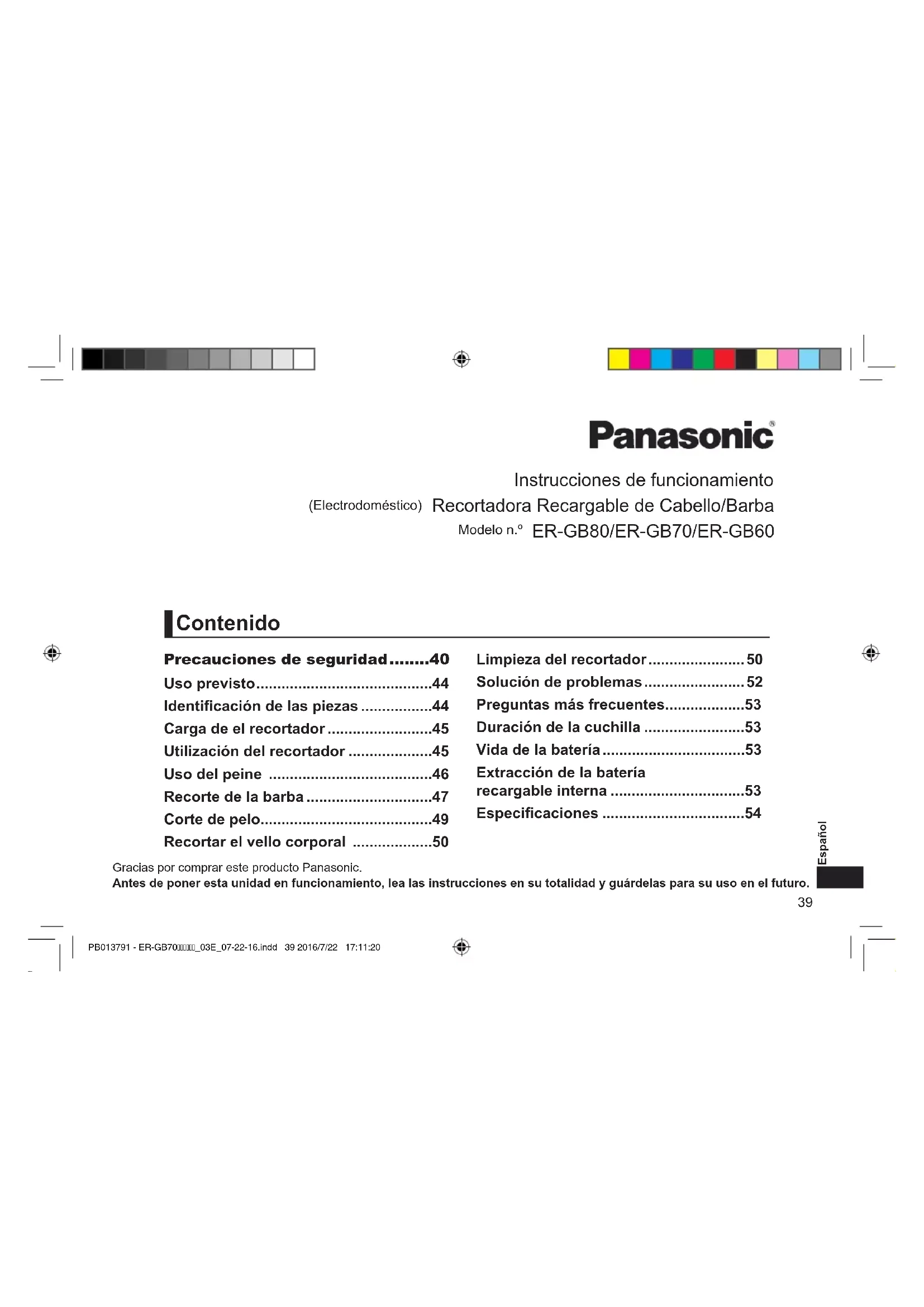 - *ER‑GB80/ER‑GB70 uniquement Caractéristiques Source d’alimentation Voir la plaque signalétique sur l’adaptateur secteur. (Conversion de tension automatique) Tension du moteur 1.2 V Temps de chargement Env. 1 heure Ce produit est destiné uniquement à l’usage domestique. PB013791 - ER-GB70_02F_07-22-16.indd 36 2016/7/22 17:12:2837 Français Déclaration sur le brouillage radioélectrique de la Commission fédérale des communications Le présent équipement a fait l’objet d’essais et a été jugé conforme aux limites pour un dispositif numérique de classe B, en vertu du Chapitre 15 des règlements de la FCC. Ces limites sont conçues pour fournir une protection raisonnable contre les interférences nuisibles lorsque l’appareil fonctionne dans une installation résidentielle. Le présent équipement génère, utilise et peut émettre de l’énergie RF s’il n’est pas installé et utilisé conformément au mode d’emploi, ce qui peut provoquer des interférences nuisibles aux communications radio. Cependant, il n’y a aucune garantie que les interférences ne surviendront pas dans une installation particulière. Si cet équipement émet des interférences nuisibles à la réception de la radio ou de la télévision, ce qui peut être déterminé lors de la mise en marche puis hors marche de l’équipement, l’utilisateur doit corriger ces interférences en prenant l’une des mesures suivantes : Réorienter ou déplacer l’antenne réceptrice. Augmenter la distance entre l’équipement et le récepteur. Connecter l’équipement à la prise d’un circuit différent de celui sur lequel le récepteur est connecté. Consulter le détaillant ou un technicien spécialisé en radio/ TV pour obtenir de l’aide. Avertissement de la FCC: Pour assurer une conformité continue, installer et utiliser conformément aux consignes fournies. Quelque changement ou modication non expressément approuvé(e) par la partie responsable de la conformité pourrait annuler l’autorité de l’utilisateur à faire fonctionner le présent équipement. Cet appareil est conforme à la partie 15 des règlements de la FCC. L’utilisation est soumise aux deux conditions suivantes: (1) Cet appareil ne doit pas provoquer d’interférences nuisibles et (2), cet appareil doit supporter toute interférence reçue, y compris les interférences pouvant provoquer un fonctionnement indésirable. PB013791 - ER-GB70_02F_07-22-16.indd 37 2016/7/22 17:12:2838 PB013791 - ER-GB70_02F_07-22-16.indd 38 2016/7/22 17:12:2839 Español Gracias por comprar este producto Panasonic. Antes de poner esta unidad en funcionamiento, lea las instrucciones en su totalidad y guárdelas para su uso en el futuro. Contenido Precauciones de seguridad p. 40