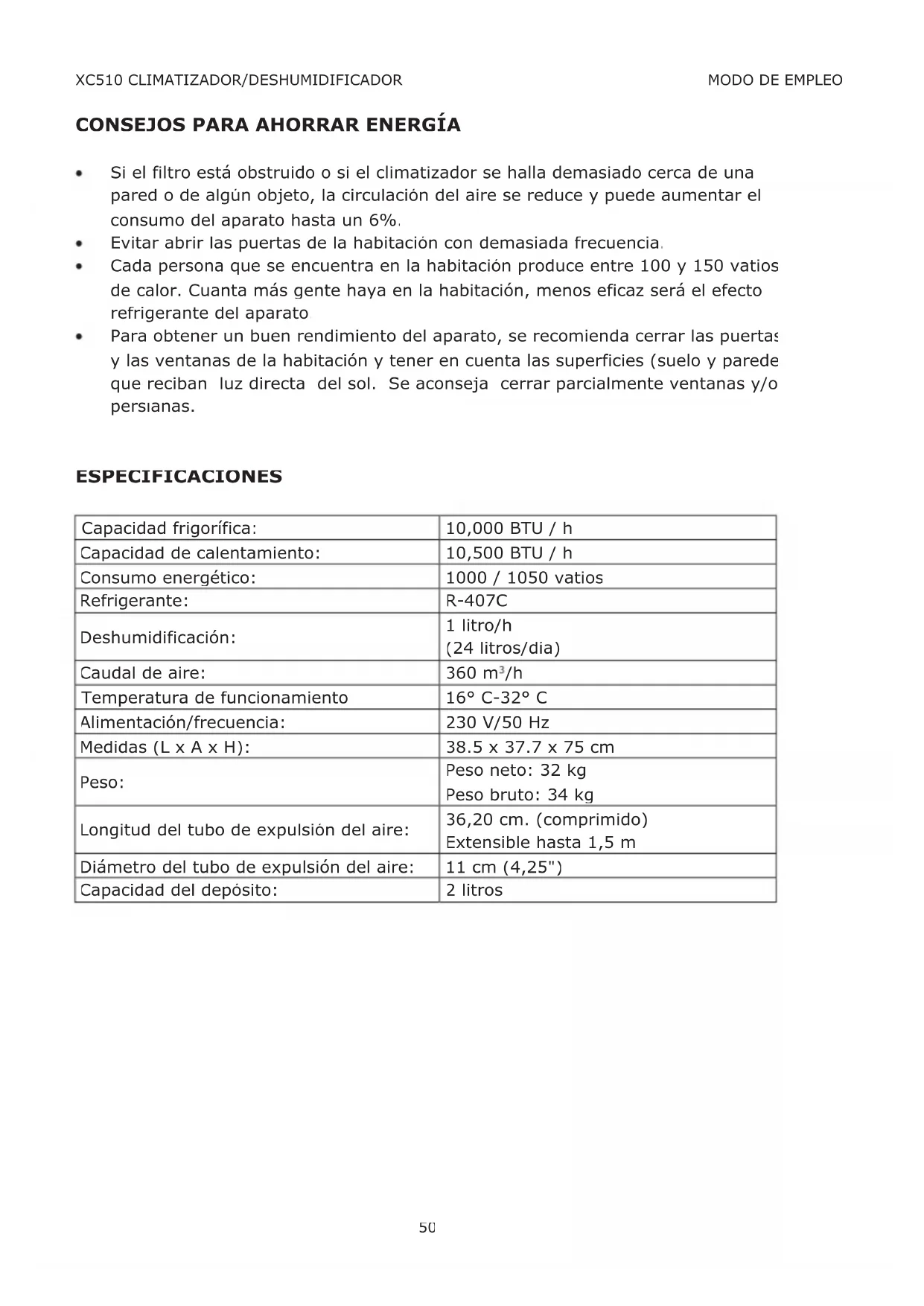Para obtener un buen rendimiento del aparato, se recomienda cerrar las puertas y las ventanas de la habitación y tener en cuenta las superficies (suelo y paredes) que reciban luz directa del sol. Se aconseja cerrar parcialmente ventanas y/o persianas. ESPECIFICACIONES Capacidad frigorífica: 10,000 BTU / h Capacidad de calentamiento: 10,500 BTU / h Consumo energético: 1000 / 1050 vatios Refrigerante: R-407C Deshumidificación: 1 litro/h (24 litros/día) Caudal de aire: 360 m