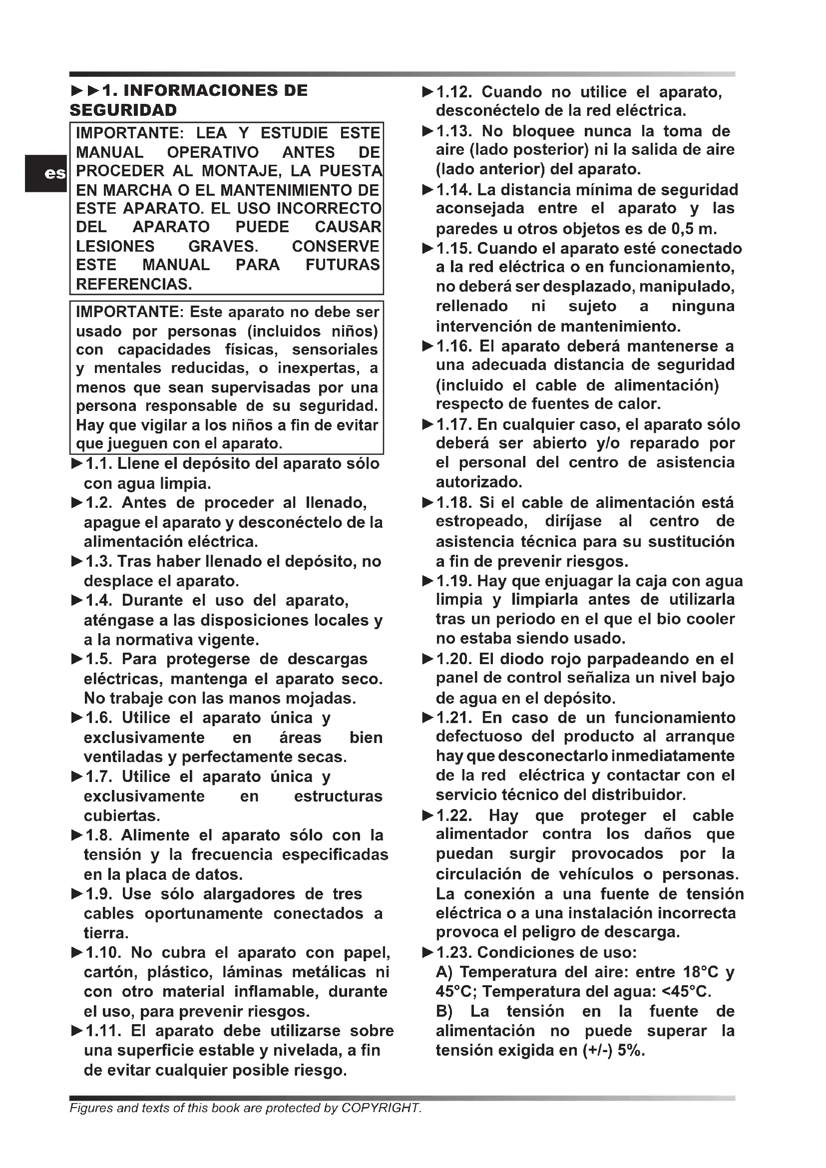 REFERENCIAS. IMPORTANTE: Este aparato no debe ser usado por personas (incluidos niños) con capacidades físicas, sensoriales y mentales reducidas, o inexpertas, a menos que sean supervisadas por una persona responsable de su seguridad. Hay que vigilar a los niños a n de evitar que jueguen con el aparato. ►1.1. Llene el depósito del aparato sólo con agua limpia. ►1.2. Antes de proceder al llenado, apague el aparato y desconéctelo de la alimentación eléctrica. ►1.3. Tras haber llenado el depósito, no desplace el aparato. ►1.4. Durante el uso del aparato, aténgase a las disposiciones locales y a la normativa vigente. ►1.5. Para protegerse de descargas eléctricas, mantenga el aparato seco. No trabaje con las manos mojadas. ►1.6. Utilice el aparato única y exclusivamente en áreas bien ventiladas y perfectamente secas. ►1.7. Utilice el aparato única y exclusivamente en estructuras cubiertas. ►1.8. Alimente el aparato sólo con la tensión y la frecuencia especicadas en la placa de datos. ►1.9. Use sólo alargadores de tres cables oportunamente conectados a tierra. ►1.10. No cubra el aparato con papel, cartón, plástico, láminas metálicas ni con otro material inamable, durante el uso, para prevenir riesgos. ►1.11. El aparato debe utilizarse sobre una supercie estable y nivelada, a n de evitar cualquier posible riesgo. ►1.12. Cuando no utilice el aparato, desconéctelo de la red eléctrica. ►1.13. No bloquee nunca la toma de aire (lado posterior) ni la salida de aire (lado anterior) del aparato. ►1.14. La distancia mínima de seguridad aconsejada entre el aparato y las paredes u otros objetos es de 0,5 m. ►1.15. Cuando el aparato esté conectado a la red eléctrica o en funcionamiento, no deberá ser desplazado, manipulado, rellenado ni sujeto a ninguna intervención de mantenimiento. ►1.16. El aparato deberá mantenerse a una adecuada distancia de seguridad (incluido el cable de alimentación) respecto de fuentes de calor. ►1.17. En cualquier caso, el aparato sólo deberá ser abierto y/o reparado por el personal del centro de asistencia autorizado. ►1.18. Si el cable de alimentación está estropeado, diríjase al centro de asistencia técnica para su sustitución a n de prevenir riesgos. ►1.19. Hay que enjuagar la caja con agua limpia y limpiarla antes de utilizarla tras un periodo en el que el bio cooler no estaba siendo usado. ►1.20. El diodo rojo parpadeando en el panel de control señaliza un nivel bajo de agua en el depósito. ►1.21. En caso de un funcionamiento defectuoso del producto al arranque hay que desconectarlo inmediatamente de la red eléctrica y contactar con el servicio técnico del distribuidor. ►1.22. Hay que proteger el cable alimentador contra los daños que puedan surgir provocados por la circulación de vehículos o personas. La conexión a una fuente de tensión eléctrica o a una instalación incorrecta provoca el peligro de descarga. ►1.23. Condiciones de uso: A) Temperatura del aire: entre 18°C y 45°C; Temperatura del agua: <45°C. B) La tensión en la fuente de alimentación no puede superar la tensión exigida en (+/-) 5%. Figures and texts of this book are protected by COPYRIGHT.es C) La entrada de aire tiene que estar libre de polvo e impurezas, o si fuera necesario hay que utilizar un sistema de depuración añadido. ►►2. DESEMBALAJE ►2.1. Quite todos los materiales de embalaje utilizados para embalar y enviar el aparato y elimínelos respetando las normas vigentes. ►2.2. Extraiga todos las piezas del embalaje. ►2.3. Controle si han sufrido desperfectos durante el transporte. Si el aparato presenta daños, informe inmediatamente al distribuidor que se lo vendió. ►►3. MONTAJE El aparato está equipado con ruedas para facilitar su manipulación. Según el modelo, las ruedas pueden venir montadas, o bien sin montar. Los componentes, suministrados con los correspondientes pernos de montaje, se encuentran en el interior del embalaje (Fig. 1). ►►4. FUNCIONAMIENTO ADVERTENCIA: Lea atentamente las ”INFORMACIONES DE SEGURIDAD”, antes de encender el aparato. ADVERTENCIA: Utilice sólo agua limpia para evitar averías u otras anomalías. ADVERTENCIA: Verique la correcta toma de tierra de su instalación eléctrica. La conexión a la red eléctrica debe realizarse de acuerdo con las normas nacionales vigentes. Alimente el aparato sólo con la tensión y la frecuencia especicadas en la placa de datos. NOTA: Estos modelos pueden conectarse a un sistema de conductos de agua a través de la conexión de una tubería al elemento de conexión (Fig. 10). ►►4.1. ENCENDIDO: ►4.1.1. Abra el portillo del depósito (Fig. 2). ►4.1.2. Llene de agua el depósito (Fig. 3); el nivel de agua debe estar comprendido entre las señales de MÍN y MÁX de la escala graduada, situada en el lateral del aparato (Fig. 4), a n de evitar riesgos. ►4.1.3. Cierre el portillo del depósito (Fig. 5). ►4.1.4. Conecte la toma de alimentación a la red eléctrica (Fig. 6). ►4.1.5. Presione el pulsador ON/OFF para encender el aparato (Fig. 9).