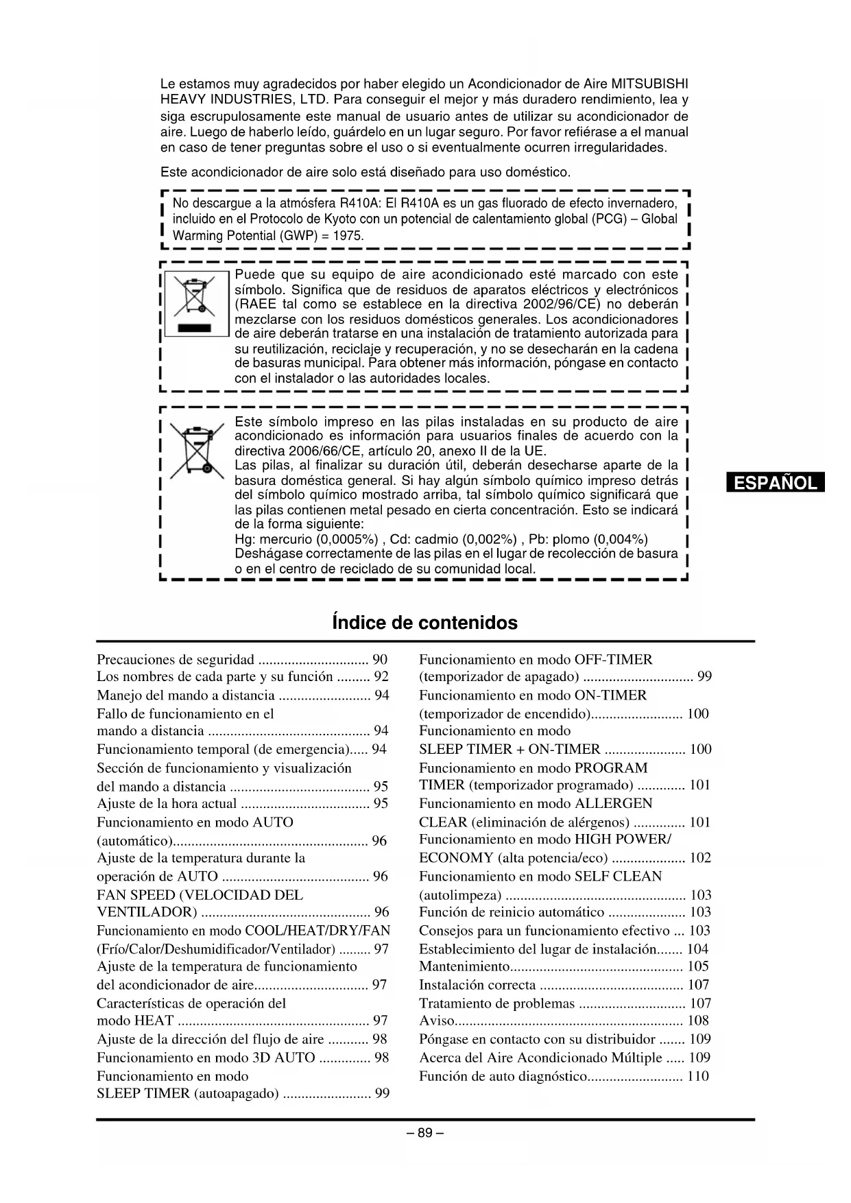 - Le estamos muy agradecidos por haber elegido un Acondicionador de Aire MITSUBISHI HEAVY INDUSTRIES, LTD. Para conseguir el mejor y más duradero rendimiento, lea y siga escrupulosamente este manual de usuario antes de utilizar su acondicionador de aire. Luego de haberlo leído, guárdelo en un lugar seguro. Por favor refiérase a el manual en caso de tener preguntas sobre el uso o si eventualmente ocurren irregularidades. Este acondicionador de aire solo está diseñado para uso doméstico. Índice de contenidos ESPAÑOL No descargue a la atmósfera R410A: El R410A es un gas fluorado de efecto invernadero, incluido en el Protocolo de Kyoto con un potencial de calentamiento global (PCG) – Global Warming Potential (GWP) = 1975. Precauciones de seguridad p. 90