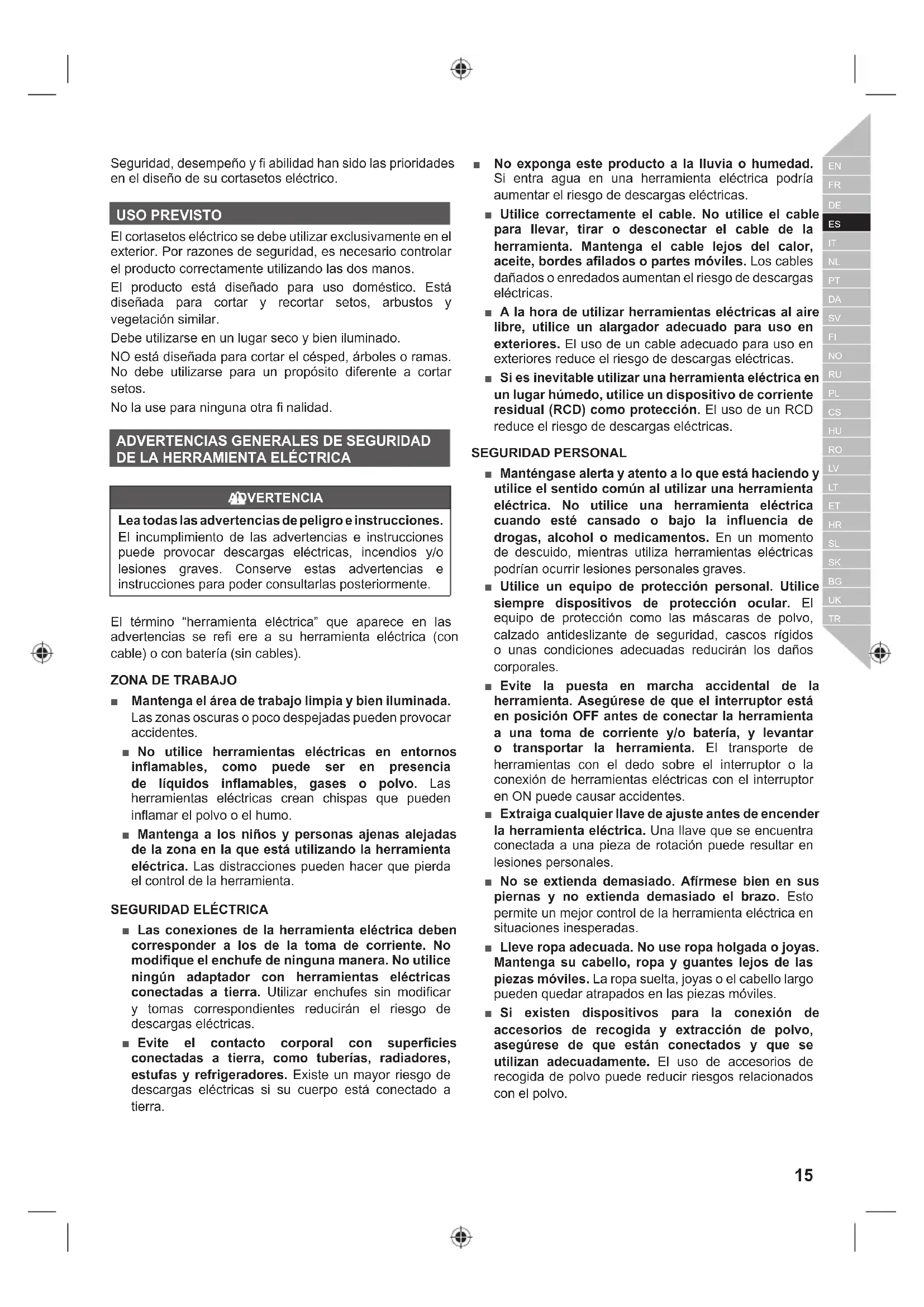 Seguridad, desempeño y fi abilidad han sido las prioridades en el diseño de su cortasetos eléctrico. USO PREVISTO El cortasetos eléctrico se debe utilizar exclusivamente en el exterior. Por razones de seguridad, es necesario controlar el producto correctamente utilizando las dos manos. El producto está diseñado para uso doméstico. Está diseñada para cortar y recortar setos, arbustos y vegetación similar. Debe utilizarse en un lugar seco y bien iluminado. NO está diseñada para cortar el césped, árboles o ramas. No debe utilizarse para un propósito diferente a cortar setos. No la use para ninguna otra fi nalidad.