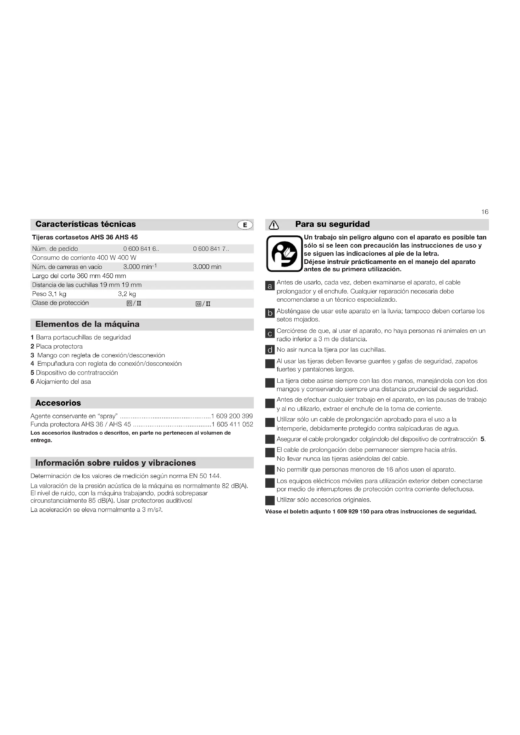 Dr. Eckerhard Strötgen Dr. Alfred Odendahl Robert Bosch GmbH, Geschäftsbereich Elektrowerkzeuge Déclaration de conformité Pour que cette garantie soit valable il y a lieu de retourner l'outil non démonté au vendeur ou à une station service Bosch accompagné de la preuve d’achat mentionnant la date d'acquisition, le nom de l'utilisateur et le nom du revendeur.16 1 Barra portacuchillas de seguridad 2 Placa protectora 3 Mango con regleta de conexión/desconexión 4 Empuñadura con regleta de conexión/desconexión 5 Dispositivo de contratracción 6 Alojamiento del asa Elementos de la máquina Accesorios Características técnicas Para su seguridad Agente conservante en “spray” ..................................................1 609 200 399 Funda protectora AHS 36 / AHS 45 ...........................................1 605 411 052 Los accesorios ilustrados o descritos, en parte no pertenecen al volumen de entrega. Determinación de los valores de medición según norma EN 50 144. La valoración de la presión acústica de la máquina es normalmente 82 dB(A). El nivel de ruido, con la máquina trabajando, podrá sobrepasar circunstancialmente 85 dB(A). Usar protectores auditivos! La aceleración se eleva normalmente a 3 m/s