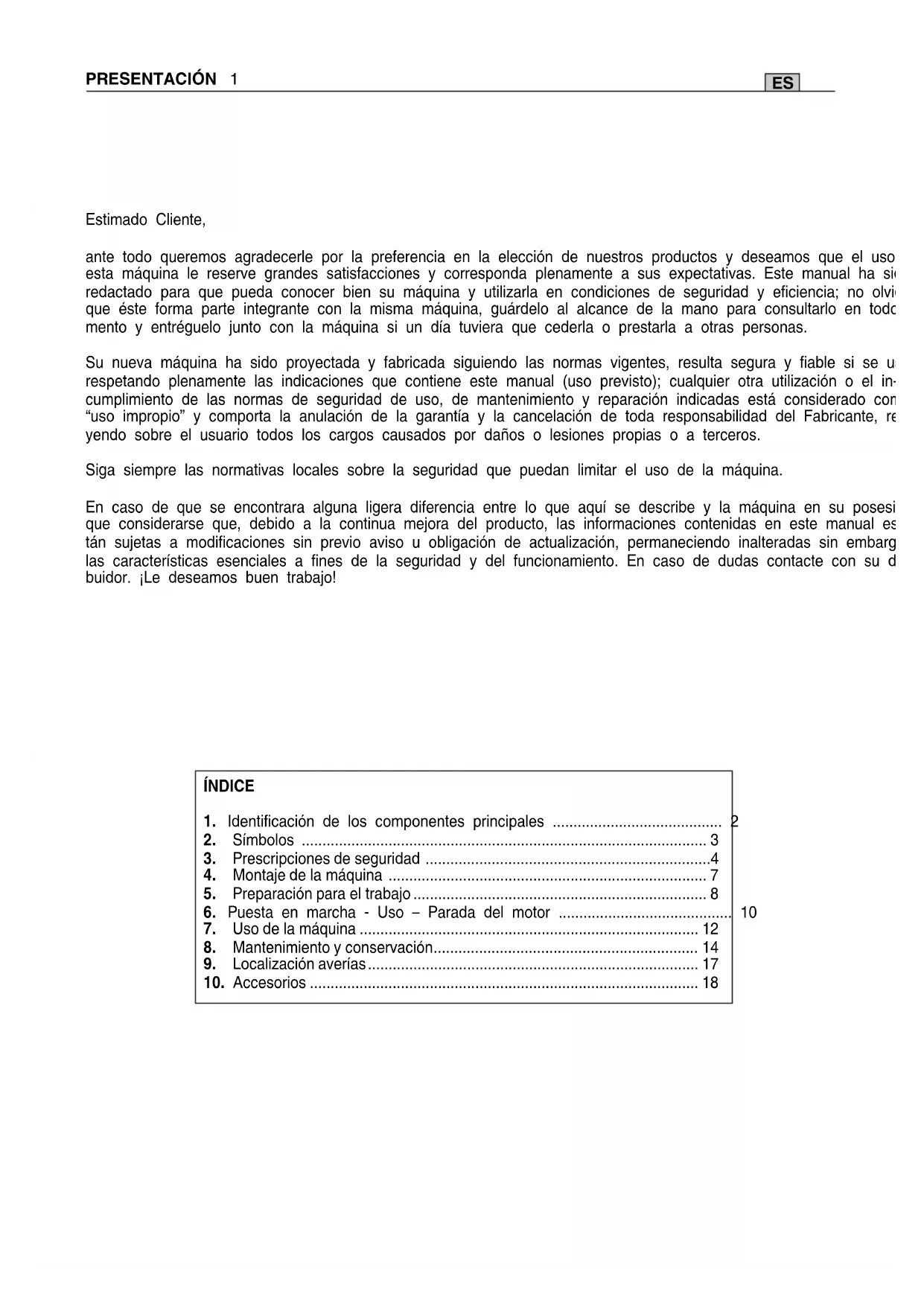 (21BPX078X) Für den Ersatz Verwendung nur über Schienen und Ketten. Wenn Sie nicht zu- gelassenen Kombinationenverwenden, kann es zu ernsthaften Verletzungen und Sch,den an der Ma- schine verursachen. ACHTUNG!ES PRESENTACIÓN 1 Estimado Cliente, ante todo queremos agradecerle por la preferencia en la elección de nuestros productos y deseamos que el uso de esta máquina le reserve grandes satisfacciones y corresponda plenamente a sus expectativas. Este manual ha sido redactado para que pueda conocer bien su máquina y utilizarla en condiciones de seguridad y eficiencia; no olvide que éste forma parte integrante con la misma máquina, guárdelo al alcance de la mano para consultarlo en todo mo- mento y entréguelo junto con la máquina si un día tuviera que cederla o prestarla a otras personas. Su nueva máquina ha sido proyectada y fabricada siguiendo las normas vigentes, resulta segura y fiable si se usa respetando plenamente las indicaciones que contiene este manual (uso previsto); cualquier otra utilización o el in- cumplimiento de las normas de seguridad de uso, de mantenimiento y reparación indicadas está considerado como “uso impropio” y comporta la anulación de la garantía y la cancelación de toda responsabilidad del Fabricante, reca- yendo sobre el usuario todos los cargos causados por daños o lesiones propias o a terceros. Siga siempre las normativas locales sobre la seguridad que puedan limitar el uso de la máquina. En caso de que se encontrara alguna ligera diferencia entre lo que aquí se describe y la máquina en su posesión, tiene que considerarse que, debido a la continua mejora del producto, las informaciones contenidas en este manual es- tán sujetas a modificaciones sin previo aviso u obligación de actualización, permaneciendo inalteradas sin embargo las características esenciales a fines de la seguridad y del funcionamiento. En caso de dudas contacte con su distri- buidor. ¡Le deseamos buen trabajo! ÍNDICE