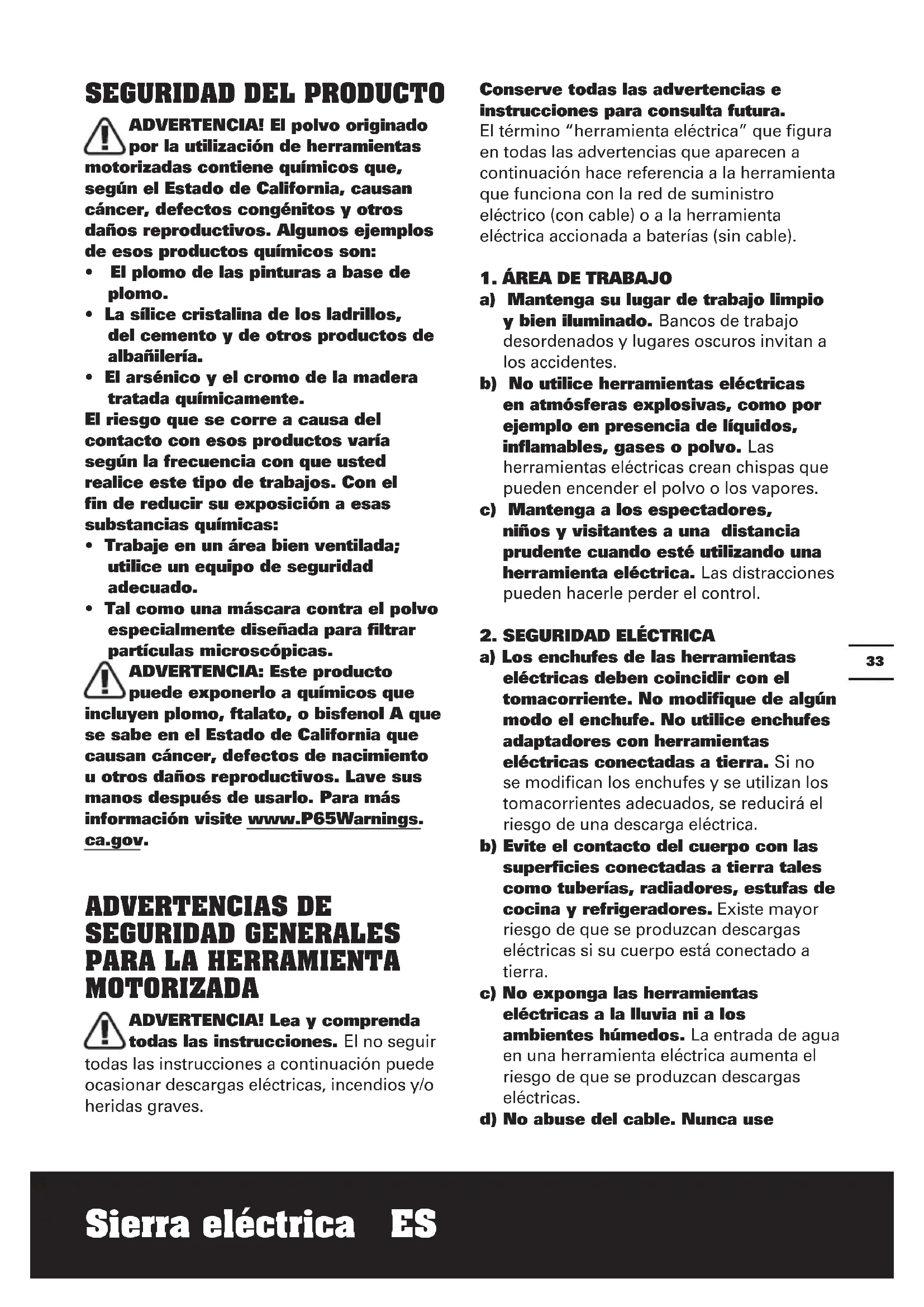 MOTORIZADA ADVERTENCIA! Lea y comprenda todas las instrucciones. El no seguir todas las instrucciones a continuación puede ocasionar descargas eléctricas, incendios y/o heridas graves. Conserve todas las advertencias e instrucciones para consulta futura. El término “herramienta eléctrica” que figura en todas las advertencias que aparecen a continuación hace referencia a la herramienta que funciona con la red de suministro eléctrico (con cable) o a la herramienta eléctrica accionada a baterías (sin cable).