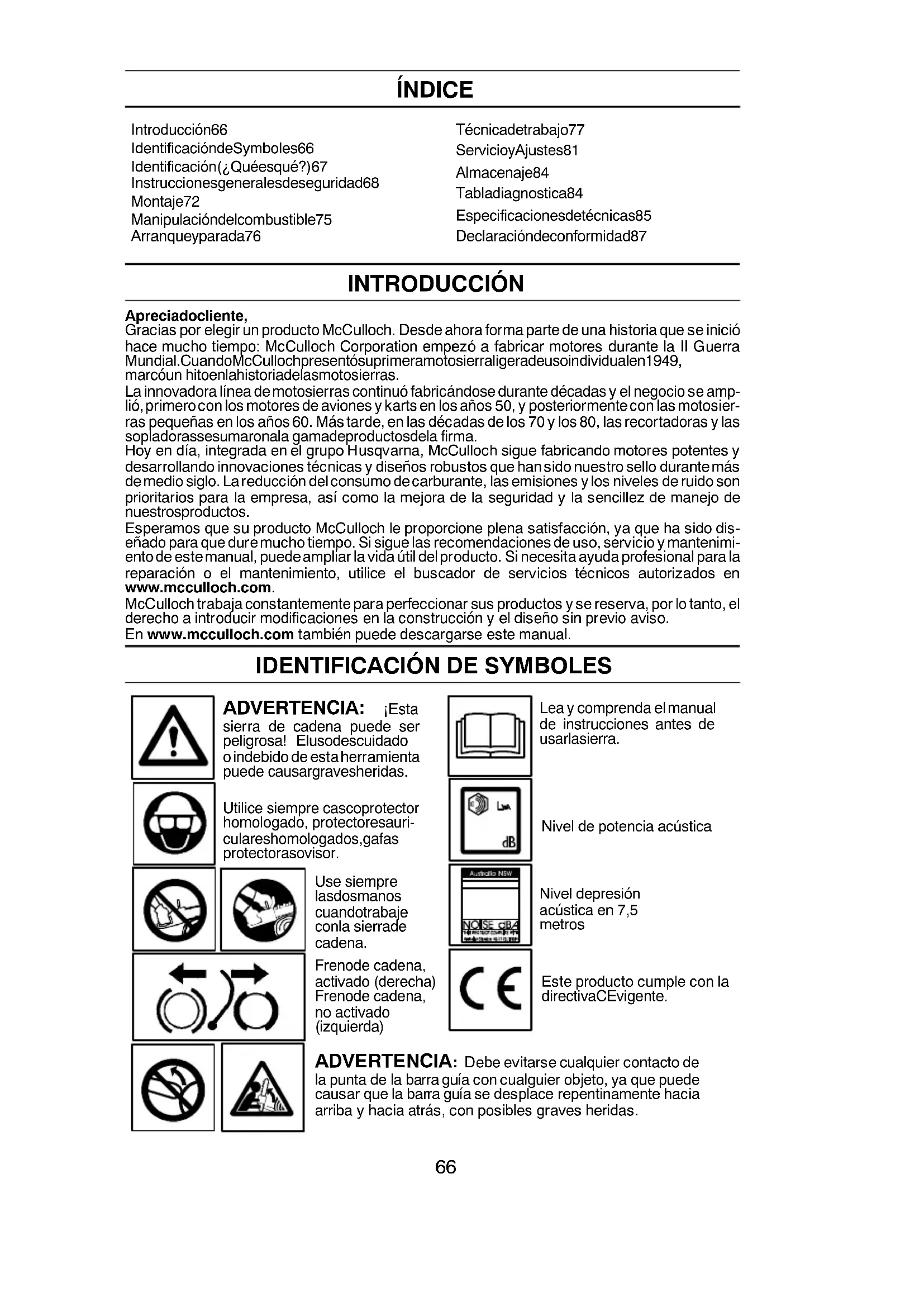 Ronnie E. Goldman, Technischer Direktor Bevollmächtigter Vertreter für Husqvarna AB, verantwortlich für die technische Dokumentation66 ÍNDICE Introducción 66 Identificación de Symboles 66 Identificación (¿Qué es qué?) 67 Instrucciones generales de seguridad 68 Montaje 72 Manipulación del combustible 75 Arranque y parada 76 Técnica de trabajo 77 Servicio y Ajustes 81 Almacenaje 84 Tabla diagnostica 84 Especificaciones de técnicas 85 Declaración de conformidad 87 INTRODUCCIÓN Apreciado cliente, Gracias por elegir un producto McCulloch. Desde ahora forma parte de una historia que se inició hace mucho tiempo: McCulloch Corporation empezó a fabricar motores durante la II Guerra Mundial. Cuando McCulloch presentó su primera motosierra ligera de uso individual en 1949, marcó un hito en la historia de las motosierras. La innovadora líneademotosierras continuó fabricándose durante décadas y el negocio se amp- lió, primero con los motores de aviones y karts en los años 50, y posteriormentecon las motosier- ras pequeñas en los años 60. Más tarde, en las décadas de los 70 y los 80, las recortadoras y las sopladoras se sumaron a la gama de productos de la firma. Hoy en día, integrada en el grupo Husqvarna, McCulloch sigue fabricando motores potentes y desarrollando innovaciones técnicas y diseños robustos que han sido nuestro sello durante más de medio siglo. La reducción delconsumo decarburante, las emisiones y los niveles de ruido son prioritarios para la empresa, así como la mejora de la seguridad y la sencillez de manejo de nuestros productos. Esperamos que su producto McCulloch le proporcione plena satisfacción, ya que ha sido dis- eñado para que dure mucho tiempo. Si sigue las recomendaciones de uso, servicio y mantenimi- ento de estemanual, puede ampliar la vida útil del producto. Si necesita ayuda profesional para la reparación o el mantenimiento, utilice el buscador de servicios técnicos autorizados en www.mcculloch.com. McCulloch trabaja constantemente para perfeccionar sus productos y se reserva, por lo tanto, el derecho a introducir modificaciones en la construcción y el diseño sin previo aviso. En www.mcculloch.com también puede descargarse este manual.