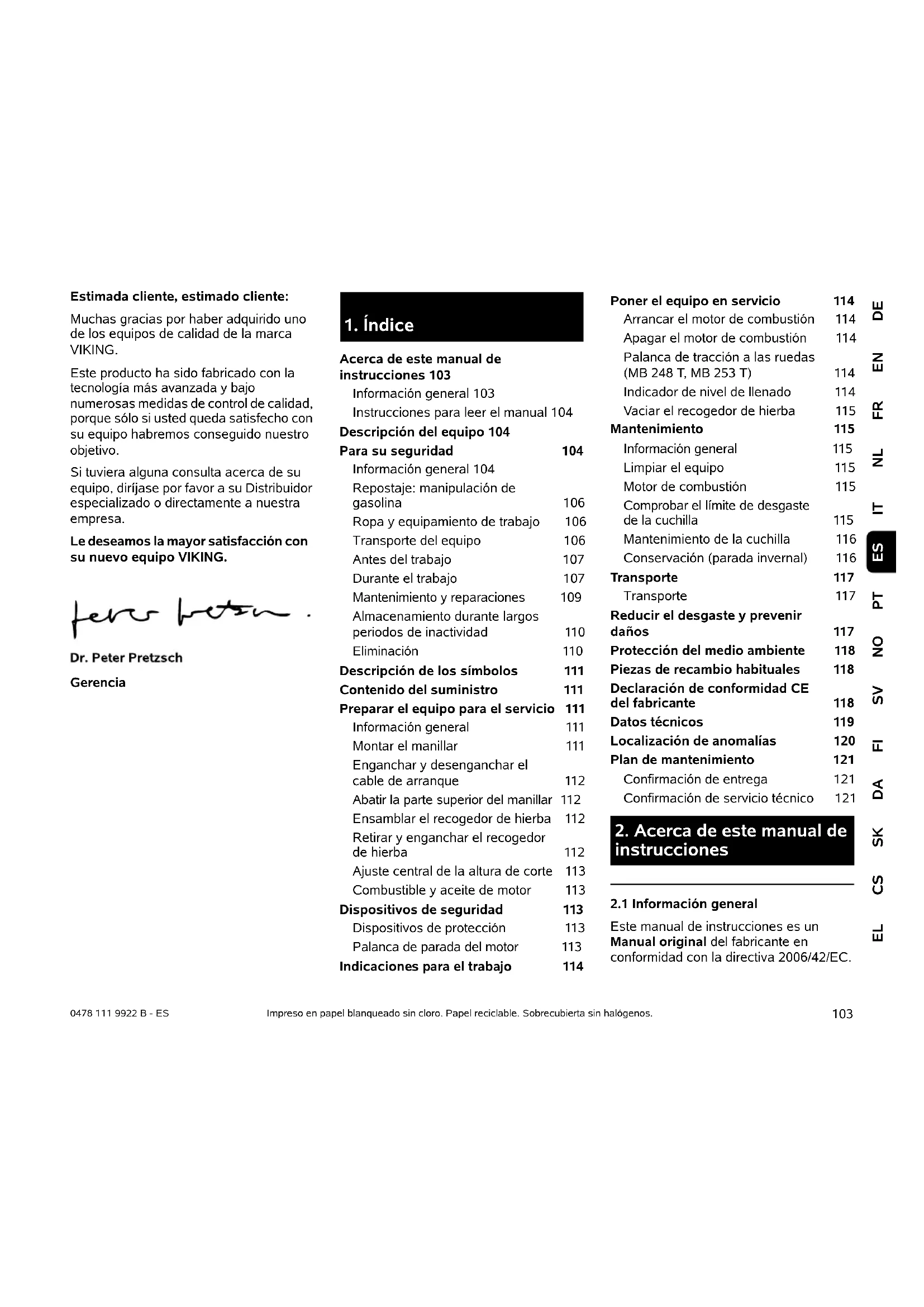Acerca de este manual de instrucciones 103 Información general 103 Instrucciones para leer el manual 104 Descripción del equipo 104 Para su seguridad 104 Información general 104 Repostaje: manipulación de gasolina 106 Ropa y equipamiento de trabajo 106 Transporte del equipo 106 Antes del trabajo 107 Durante el trabajo 107 Mantenimiento y reparaciones 109 Almacenamiento durante largos periodos de inactividad 110 Eliminación 110 Descripción de los símbolos 111 Contenido del suministro 111 Preparar el equipo para el servicio 111 Información general 111 Montar el manillar 111 Enganchar y desenganchar el cable de arranque 112 Abatir la parte superior del manillar 112 Ensamblar el recogedor de hierba 112 Retirar y enganchar el recogedor de hierba 112 Ajuste central de la altura de corte 113 Combustible y aceite de motor 113 Dispositivos de seguridad 113 Dispositivos de protección 113 Palanca de parada del motor 113 Indicaciones para el trabajo 114 Poner el equipo en servicio 114 Arrancar el motor de combustión 114 Apagar el motor de combustión 114 Palanca de tracción a las ruedas (MB 248 T, MB 253 T) 114 Indicador de nivel de llenado 114 Vaciar el recogedor de hierba 115 Mantenimiento 115 Información general 115 Limpiar el equipo 115 Motor de combustión 115 Comprobar el límite de desgaste de la cuchilla 115 Mantenimiento de la cuchilla 116 Conservación (parada invernal) 116 Transporte 117 Transporte 117 Reducir el desgaste y prevenir daños 117 Protección del medio ambiente 118 Piezas de recambio habituales 118 Declaración de conformidad CE del fabricante 118 Datos técnicos 119 Localización de anomalías 120 Plan de mantenimiento 121 Confirmación de entrega 121 Confirmación de servicio técnico 121