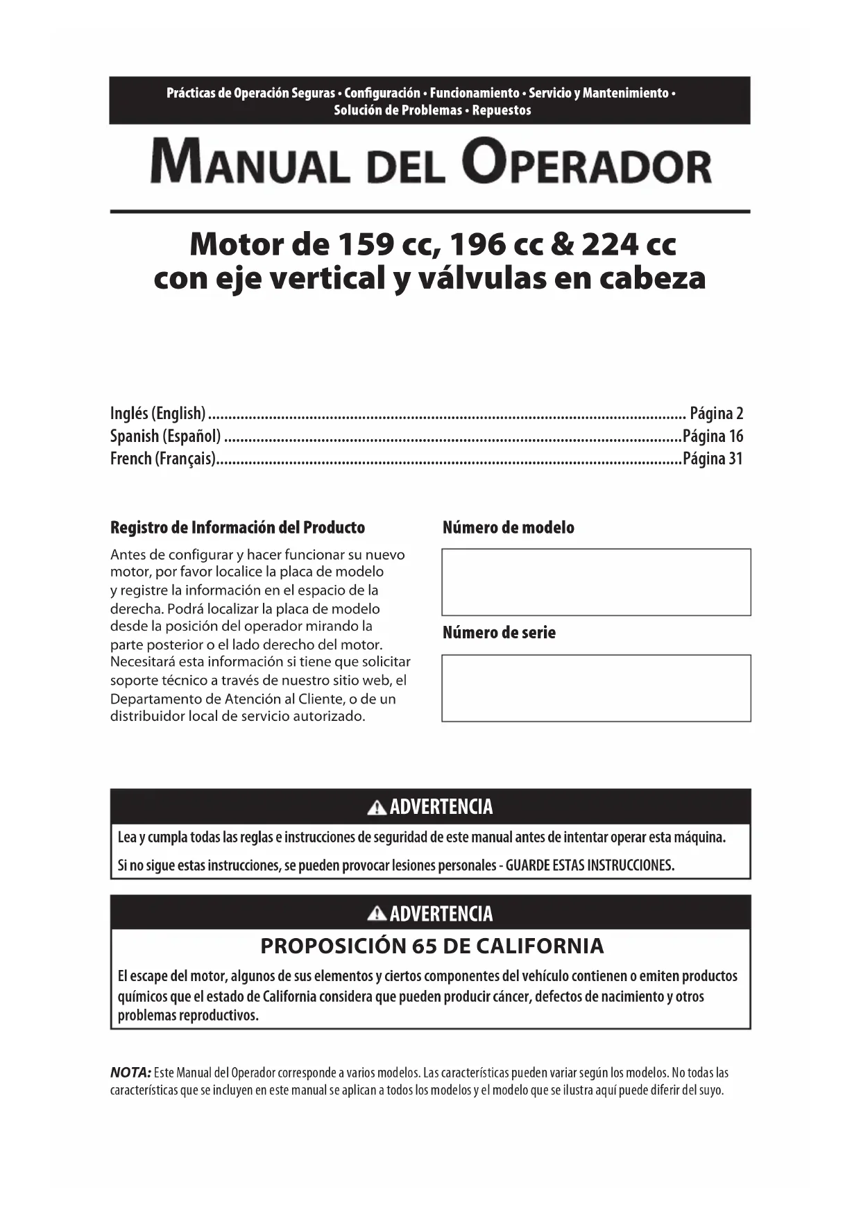 El escape del motor, algunos de sus elementos y ciertos componentes del vehículo contienen o emiten productos químicos que el estado de California considera que pueden producir cáncer, defectos de nacimiento y otros problemas reproductivos. Registro de Información del Producto Antes de configurar y hacer funcionar su nuevo motor, por favor localice la placa de modelo y registre la información en el espacio de la derecha. Podrá localizar la placa de modelo desde la posición del operador mirando la parte posterior o el lado derecho del motor. Necesitará esta información si tiene que solicitar soporte técnico a través de nuestro sitio web, el Departamento de Atención al Cliente, o de un distribuidor local de servicio autorizado. Número de modelo Número de serie Inglés (English) ...................................................................................................................... Página 2 Spanish (Español) .................................................................................................................Página 16 French (Français) ...................................................................................................................Página 3117