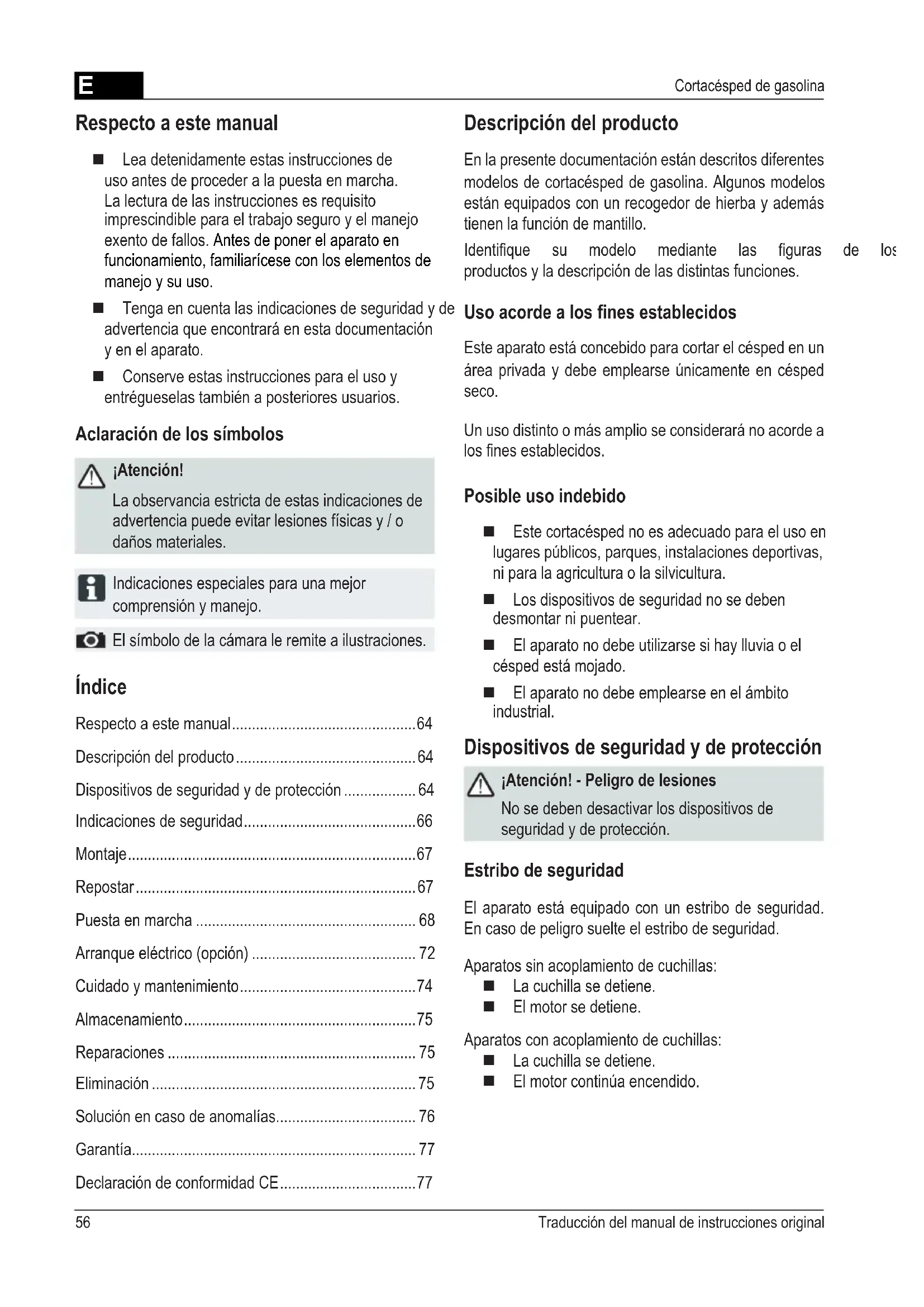 - Cortacésped de gasolina Índice Respecto a este manual p. 64