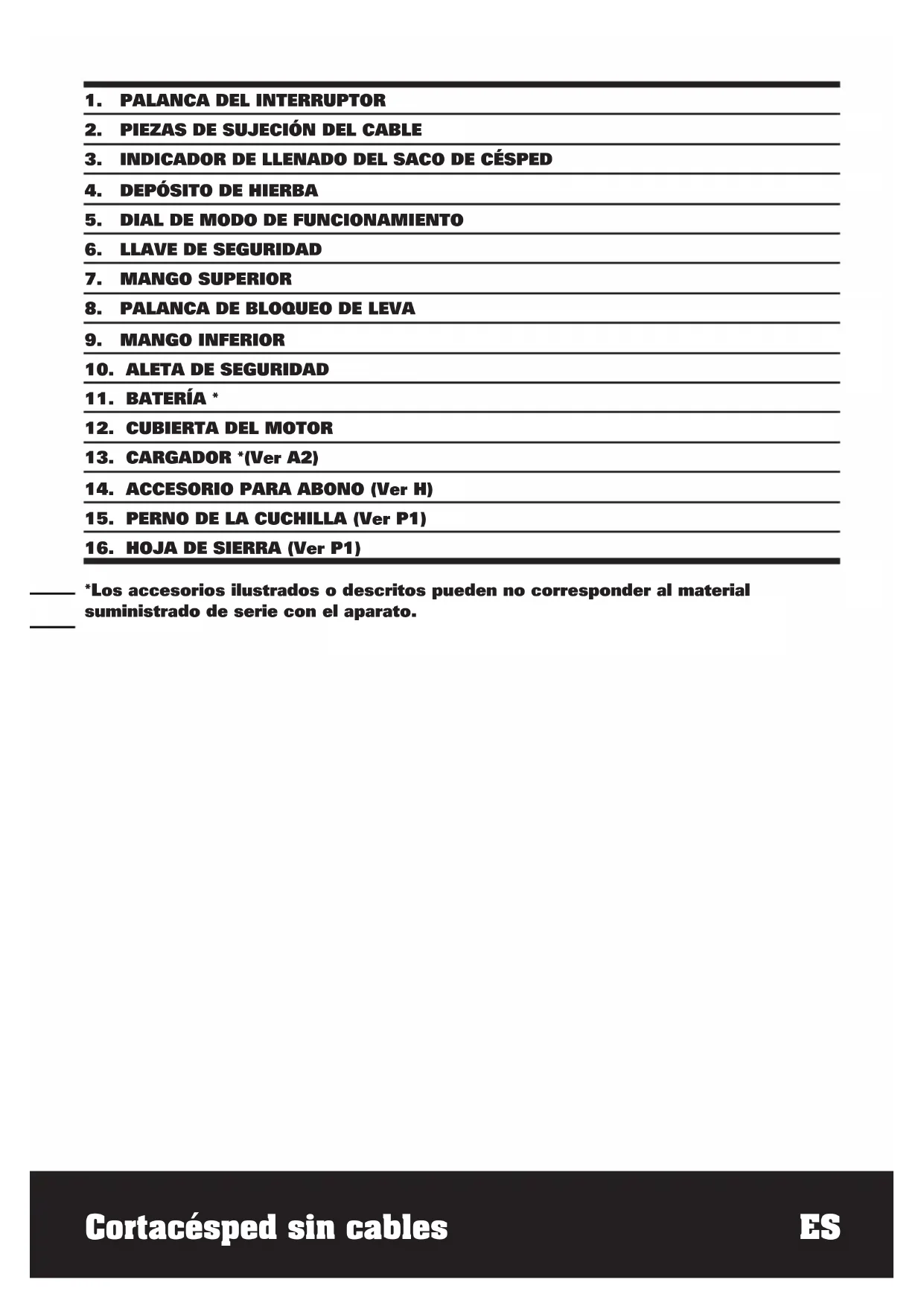 ACCESORIOS Batería 1 Cargador 1 Bolsa de recolección de hierba 1 Accesorio para abono 1 Palanca de bloqueo de leva 2 Recomendamos que adquiera todos sus accesorios en el mismo comercio donde compró la herramienta. Utilice accesorios de buena calidad y de marca reconocida. Elija los accesorios de acuerdo con el trabajo que pretende realizar. Consulte los estuches de los accesorios para más detalles. El personal del comercio también puede ayudar y aconsejar.5958 Cortacésped sin cables