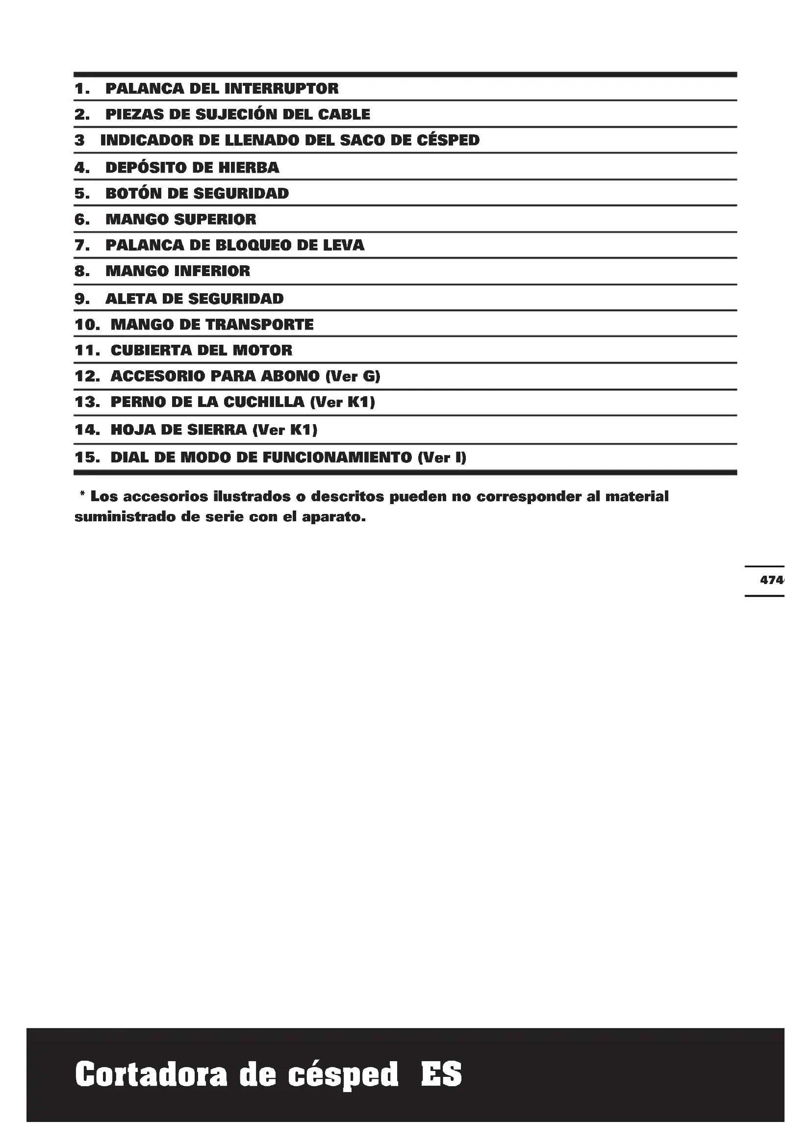- Los accesorios ilustrados o descritos pueden no corresponder al material suministrado de serie con el aparato.4948 Cortadora de césped ES