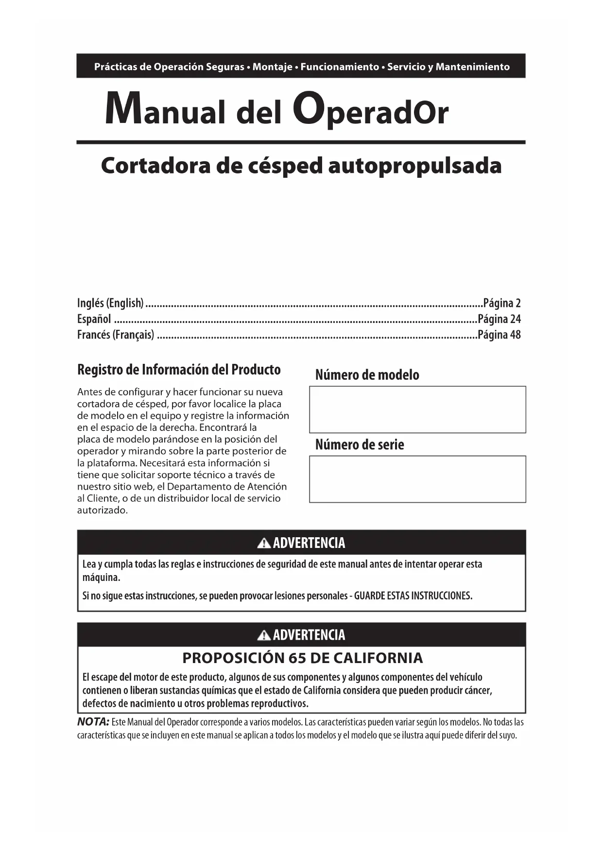 El escape del motor de este producto, algunos de sus componentes y algunos componentes del vehículo contienen o liberan sustancias químicas que el estado de California considera que pueden producir cáncer, defectos de nacimiento u otros problemas reproductivos. Registro de Información del Producto Antes de configurar y hacer funcionar su nueva cortadora de césped, por favor localice la placa de modelo en el equipo y registre la información en el espacio de la derecha. Encontrará la placa de modelo parándose en la posición del operador y mirando sobre la parte posterior de la plataforma. Necesitará esta información si tiene que solicitar soporte técnico a través de nuestro sitio web, el Departamento de Atención al Cliente, o de un distribuidor local de servicio autorizado. Número de modelo Número de serie Inglés (English) .......................................................................................................................Página 2 Español ................................................................................................................................Página 24 Francés (Français) .................................................................................................................Página 4825