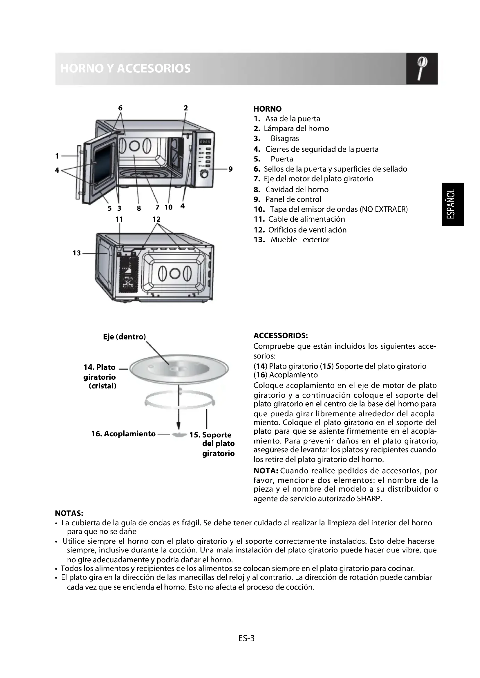 ACCESSORIOS: Compruebe que están incluidos los siguientes acce- sorios: (14) Plato giratorio (15) Soporte del plato giratorio (16) Acoplamiento Coloque acoplamiento en el eje de motor de plato giratorio y a continuación coloque el soporte del plato giratorio en el centro de la base del horno para que pueda girar libremente alrededor del acopla- miento. Coloque el plato giratorio en el soporte del plato para que se asiente firmemente en el acopla- miento. Para prevenir daños en el plato giratorio, asegúrese de levantar los platos y recipientes cuando los retire del plato giratorio del horno. NOTA: Cuando realice pedidos de accesorios, por favor, mencione dos elementos: el nombre de la pieza y el nombre del modelo a su distribuidor o agente de servicio autorizado SHARP. NOTAS: