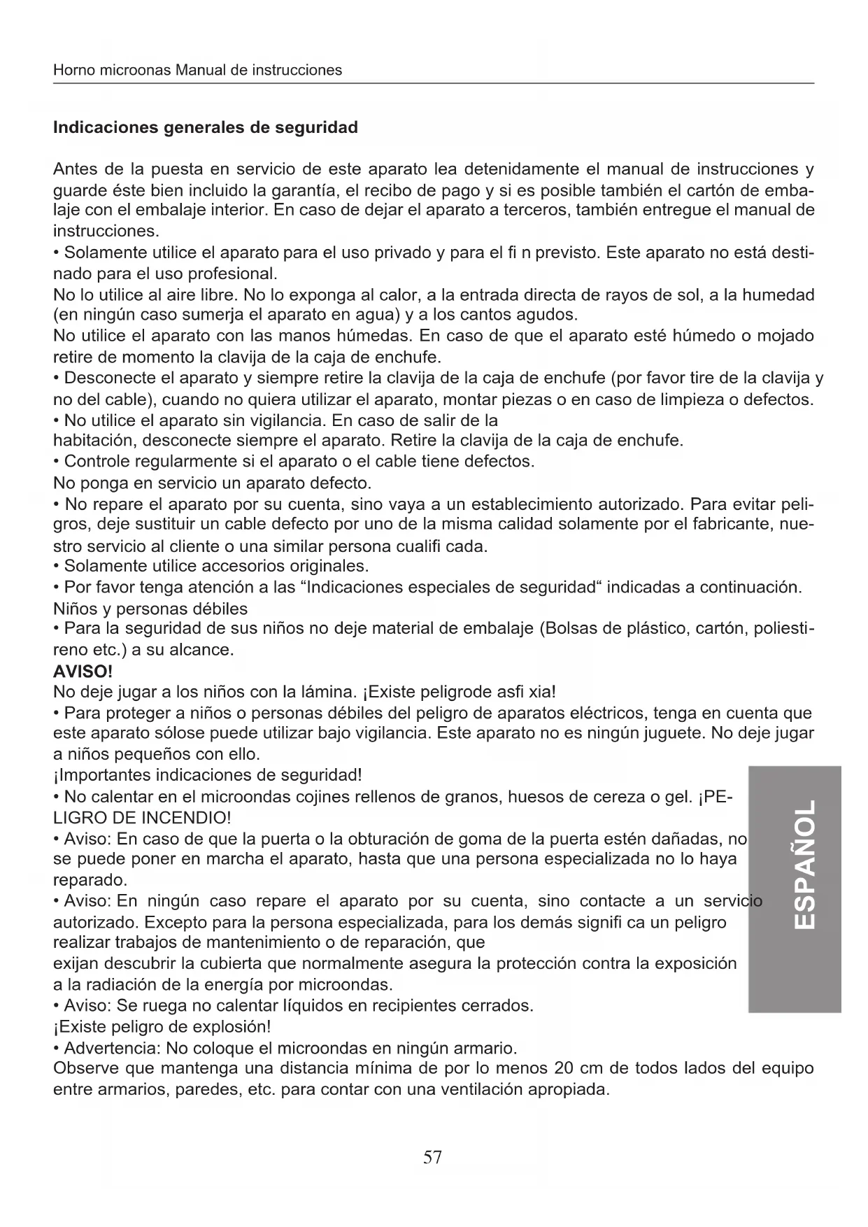 - Aviso: En ningún caso repare el aparato por su cuenta, sino contacte a un servicios autorizzato. Excepto para la persona especializada, para los demás signifi ca un peligro realizar problemas de mantenimiento o de reparación, que exijan descubrir la cubierta que normalmente asegura la protección contra la exposión a la radiación de la energia por microondas.