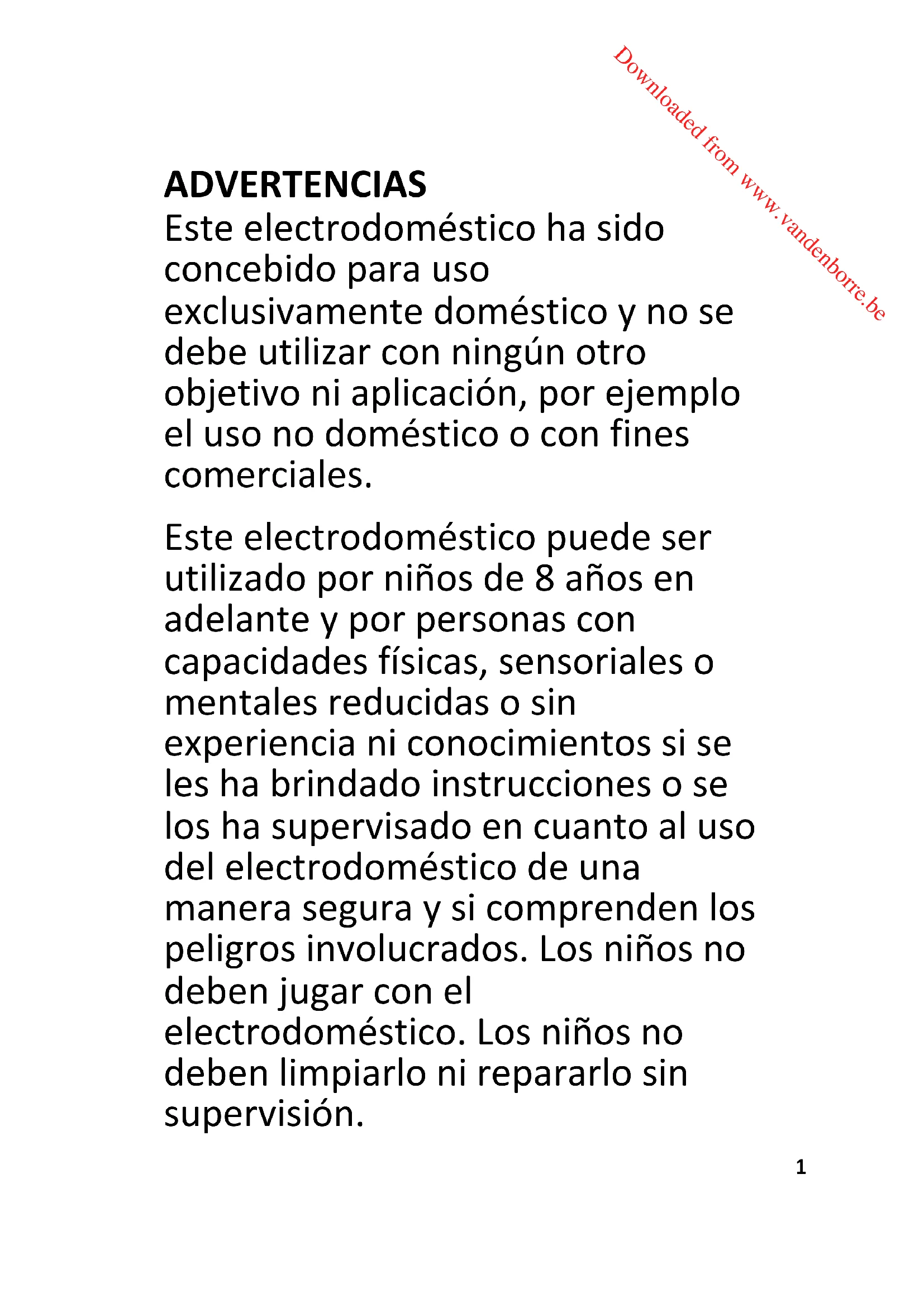 Downloaded from www.vandenborre.beADVERTENCIAS Este electrodoméstico ha sido concebido para uso exclusivamente doméstico y no se debe utilizar con ningún otro objetivo ni aplicación, por ejemplo el uso no doméstico o con fines comerciales. Este electrodoméstico puede ser utilizado por niños de 8 años en adelante y por personas con capacidades físicas, sensoriales o mentales reducidas o sin experiencia ni conocimientos si se les ha brindado instrucciones o se los ha supervisado en cuanto al uso del electrodoméstico de una manera segura y si comprenden los peligros involucrados. Los niños no deben jugar con el electrodoméstico. Los niños no deben limpiarlo ni repararlo sin supervisión.