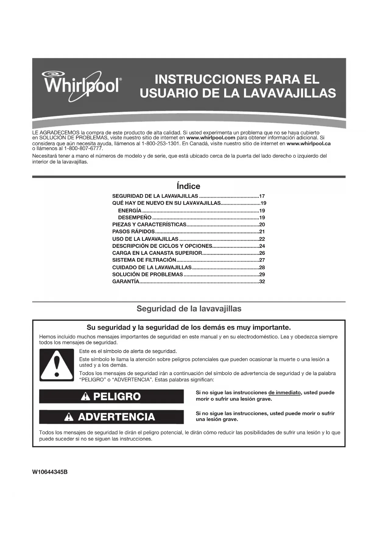 Whirlpool makes no representations about the quality, durability, or need for service or repair of this major appliance other than the representations contained in this warranty. If you want a longer or more comprehensive warranty than the limited warranty that comes with this major appliance, you should ask Whirlpool or your retailer about buying an extended warranty. LIMITATION OF REMEDIES; EXCLUSION OF INCIDENTAL AND CONSEQUENTIAL DAMAGES YOUR SOLE AND EXCLUSIVE REMEDY UNDER THIS LIMITED WARRANTY SHALL BE PRODUCT REPAIR AS PROVIDED HEREIN. WHIRLPOOL SHALL NOT BE LIABLE FOR INCIDENTAL OR CONSEQUENTIAL DAMAGES. Some states and provinces do not allow the exclusion or limitation of incidental or consequential damages, so these limitations and exclusions may not apply to you. This warranty gives you specific legal rights, and you also may have other rights that vary from state to state or province to province. W10644345BW10644345B Índice Si no sigue las instrucciones de inmediato, usted puede morir o sufrir una lesión grave. Si no sigue las instrucciones, usted puede morir o sufrir una lesión grave. Todos los mensajes de seguridad le dirán el peligro potencial, le dirán cómo reducir las posibilidades de sufrir una lesión y lo que puede suceder si no se siguen las instrucciones. Su seguridad y la seguridad de los demás es muy importante. Hemos incluido muchos mensajes importantes de seguridad en este manual y en su electrodoméstico. Lea y obedezca siempre todos los mensajes de seguridad. ADVERTENCIA PELIGRO Este es el símbolo de alerta de seguridad.Este símbolo le llama la atención sobre peligros potenciales que pueden ocasionar la muerte o una lesión a usted y a los demás.Todos los mensajes de seguridad irán a continuación del símbolo de advertencia de seguridad y de la palabra “PELIGRO” o “ADVERTENCIA”. Estas palabras significan: Seguridad de la lavavajillas LE AGRADECEMOS la compra de este producto de alta calidad. Si usted experimenta un problema que no se haya cubierto en SOLUCIÓN DE PROBLEMAS, visite nuestro sitio de internet en www.whirlpool.com para obtener información adicional. Si considera que aún necesita ayuda, llámenos al 1-800-253-1301. En Canadá, visite nuestro sitio de internet en www.whirlpool.ca o llámenos al 1-800-807-6777. Necesitará tener a mano el números de modelo y de serie, que está ubicado cerca de la puerta del lado derecho o izquierdo del interior de la lavavajillas.