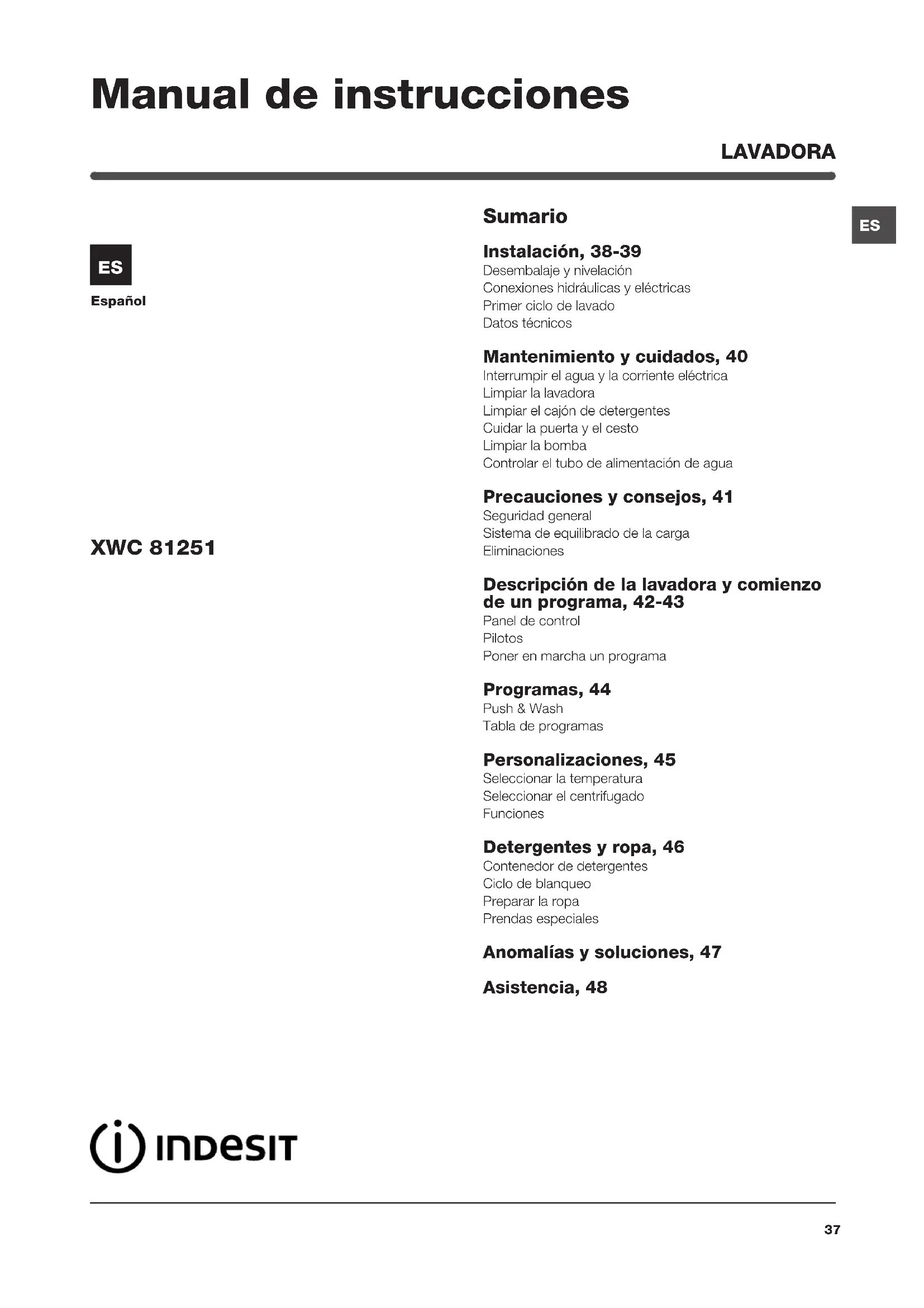 Español Sumario Instalación, 38-39 Desembalaje y nivelación Conexiones hidráulicas y eléctricas Primer ciclo de lavado Datos técnicos Mantenimiento y cuidados, 40 Interrumpir el agua y la corriente eléctrica Limpiar la lavadora Limpiar el cajón de detergentes Cuidar la puerta y el cesto Limpiar la bomba Controlar el tubo de alimentación de agua Precauciones y consejos, 41 Seguridad general Sistema de equilibrado de la carga Eliminaciones Descripción de la lavadora y comienzo de un programa, 42-43 Panel de control Pilotos Poner en marcha un programa Programas, 44 Push & Wash Tabla de programas Personalizaciones, 45 Seleccionar la temperatura Seleccionar el centrifugado Funciones Detergentes y ropa, 46 Contenedor de detergentes Ciclo de blanqueo Preparar la ropa Prendas especiales Anomalías y soluciones, 47 Asistencia, 48