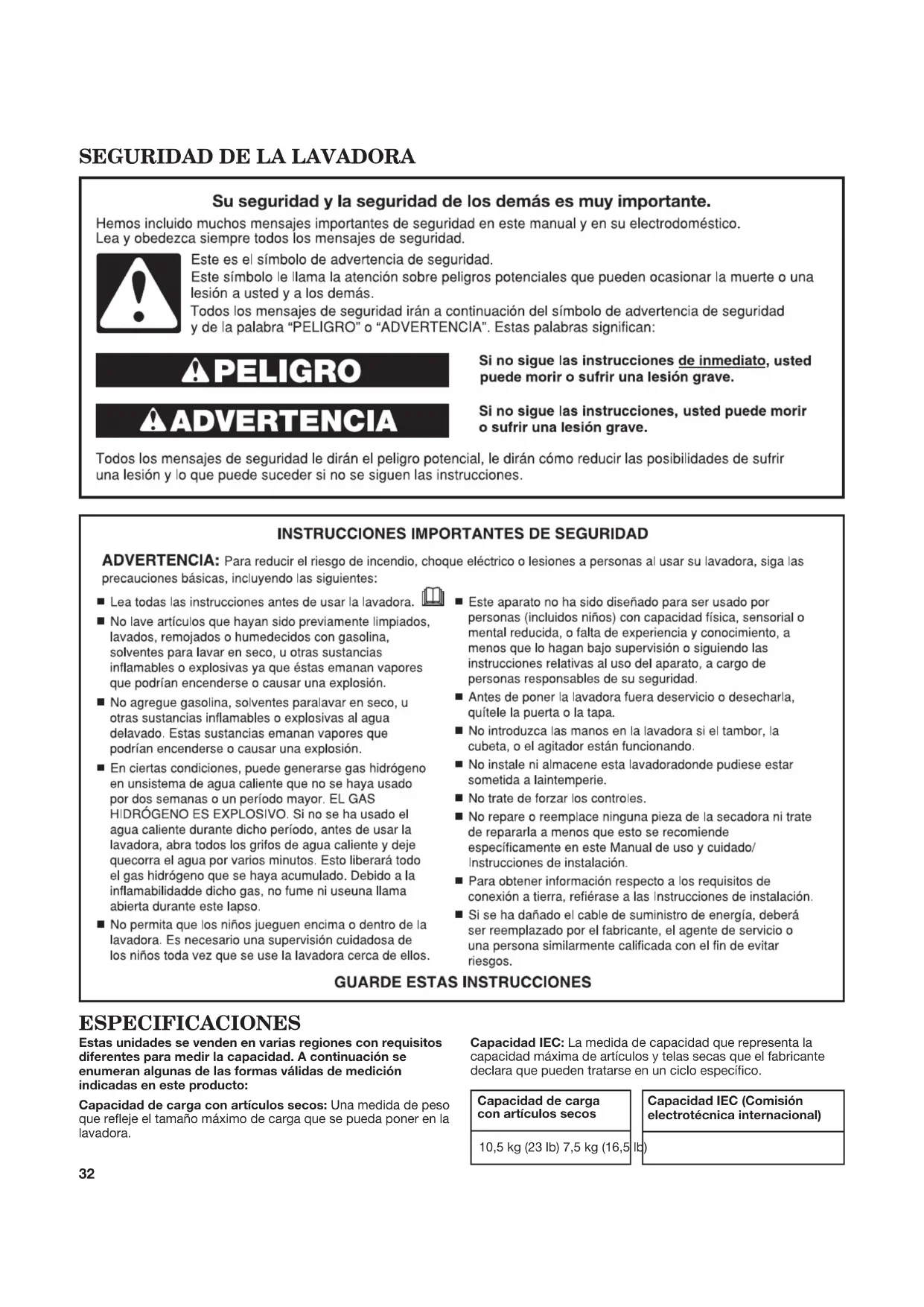 ESPECIFICACIONES Capacidad de carga con artículos secos Capacidad IEC (Comisión electrotécnica internacional) 10,5 kg (23 lb) 7,5 kg (16,5 lb) Estas unidades se venden en varias regiones con requisitos diferentes para medir la capacidad. A continuación se enumeran algunas de las formas válidas de medición indicadas en este producto: Capacidad de carga con artículos secos: Una medida de peso que reeje el tamaño máximo de carga que se pueda poner en la lavadora. Capacidad IEC: La medida de capacidad que representa la capacidad máxima de artículos y telas secas que el fabricante declara que pueden tratarse en un ciclo especíco.33 Capacidad IEC (Comisión electrotécnica internacional) Lid Locked (Bloqueo de la tapa) Para obtener velocidades más rápidas de exprimido, la tapa se bloqueará y se encenderá la luz de Tapa bloqueada (Lid Locked). Cuando esta luz está encendida, la tapa está asegurada y no se puede abrir. Cuando esta luz está parpadeando, la lavadora está en pausa. Cuando esta luz está apagada, la tapa puede abrirse. Después de comenzar un ciclo, la tapa se bloquea, se desbloquea y se vuelve a bloquear. Si necesita abrir la tapa para agregar una prenda después de esto, debe presionar Inicio/Pausa/Desbloqueo (START/Pause/ Unlock) y esperar a que la tapa se desbloquee. La tapa sólo se desbloqueará una vez que se haya detenido el movimiento de la lavadora. Según en qué momento trate de pausar el ciclo, es posible que transcurran varios segundos a varios minutos hasta que la tapa se desbloquee. Sensing (Detección) Esta lavadora realizará una serie de giros para comprobar el equilibrio de la carga. Cuando se pone en marcha una carga, es posible que transcurran entre dos y tres minutos hasta que el agua comience a entrar en la canasta. Durante este tiempo, se escuchan una serie de chasquidos y una señal de zumbido que indican que la tecnología de detección está determinando si hay una carga desequilibrada. IMPORTANTE: