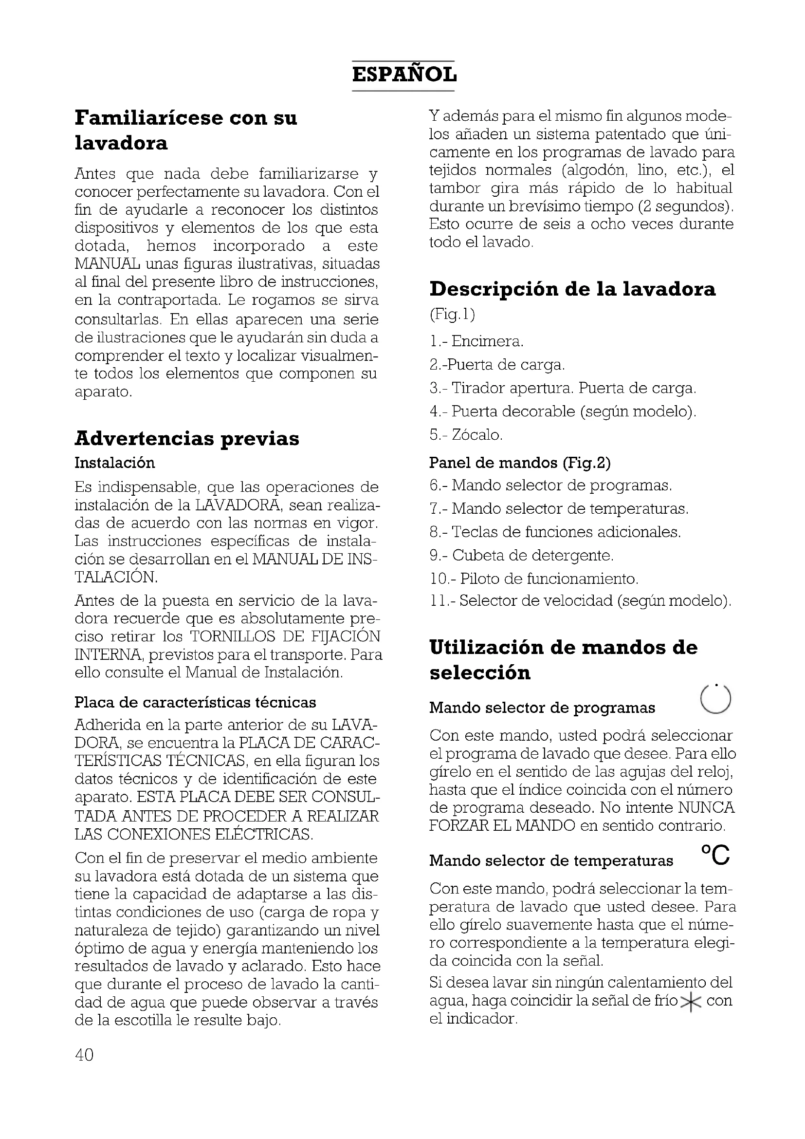 LAS CONEXIONES ELÉCTRICAS. Con el fin de preservar el medio ambiente su lavadora está dotada de un sistema que tiene la capacidad de adaptarse a las dis- tintas condiciones de uso (carga de ropa y naturaleza de tejido) garantizando un nivel óptimo de agua y energía manteniendo los resultados de lavado y aclarado. Esto hace que durante el proceso de lavado la canti- dad de agua que puede observar a través de la escotilla le resulte bajo. Y además para el mismo fin algunos mode- los añaden un sistema patentado que úni- camente en los programas de lavado para tejidos normales (algodón, lino, etc.), el tambor gira más rápido de lo habitual durante un brevísimo tiempo (2 segundos). Esto ocurre de seis a ocho veces durante todo el lavado. Descripción de la lavadora (Fig.1) 1.- Encimera. 2.-Puerta de carga. 3.- Tirador apertura. Puerta de carga. 4.- Puerta decorable (según modelo). 5.- Zócalo. Panel de mandos (Fig.2) 6.- Mando selector de programas. 7.- Mando selector de temperaturas. 8.- Teclas de funciones adicionales. 9.- Cubeta de detergente. 10.- Piloto de funcionamiento. 11.- Selector de velocidad (según modelo). Utilización de mandos de selección Mando selector de programas Con este mando, usted podrá seleccionar el programa de lavado que desee. Para ello gírelo en el sentido de las agujas del reloj, hasta que el índice coincida con el número de programa deseado. No intente NUNCA FORZAR EL MANDO en sentido contrario. Mando selector de temperaturas Con este mando, podrá seleccionar la tem- peratura de lavado que usted desee. Para ello gírelo suavemente hasta que el núme- ro correspondiente a la temperatura elegi- da coincida con la señal. Si desea lavar sin ningún calentamiento del agua, haga coincidir la señal de frío con el indicador.