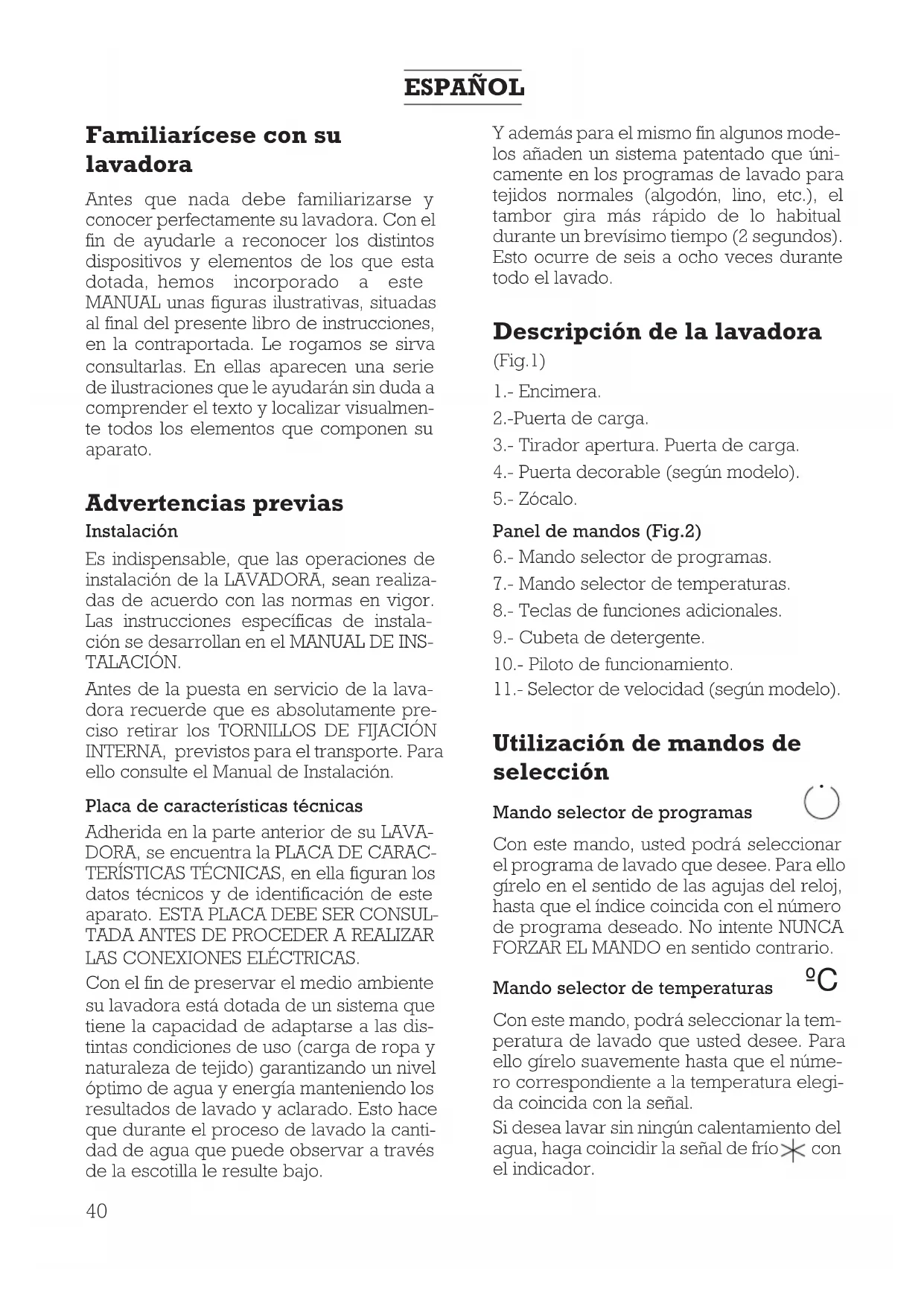 ESPAÑOL LJ6A017A0 20/4/01 17:16 P‡gina 39Familiarícese con su lavadora Antes que nada debe familiarizarse y conocer perfectamente su lavadora. Con el fin de ayudarle a reconocer los distintos dispositivos y elementos de los que esta dotada, hemos incorporado a este MANUAL unas figuras ilustrativas, situadas al final del presente libro de instrucciones, en la contraportada. Le rogamos se sirva consultarlas. En ellas aparecen una serie de ilustraciones que le ayudarán sin duda a comprender el texto y localizar visualmen- te todos los elementos que componen su aparato. Advertencias previas Instalación Es indispensable, que las operaciones de instalación de la LAVADORA, sean realiza- das de acuerdo con las normas en vigor. Las instrucciones específicas de instala- ción se desarrollan en el MANUAL DE INS- TALACIÓN. Antes de la puesta en servicio de la lava- dora recuerde que es absolutamente pre- ciso retirar los TORNILLOS DE FIJACIÓN INTERNA, previstos para el transporte. Para ello consulte el Manual de Instalación. Placa de características técnicas Adherida en la parte anterior de su LAVA- DORA, se encuentra la PLACA DE CARAC- TERÍSTICAS TÉCNICAS, en ella figuran los datos técnicos y de identificación de este aparato. ESTA PLACA DEBE SER CONSUL-