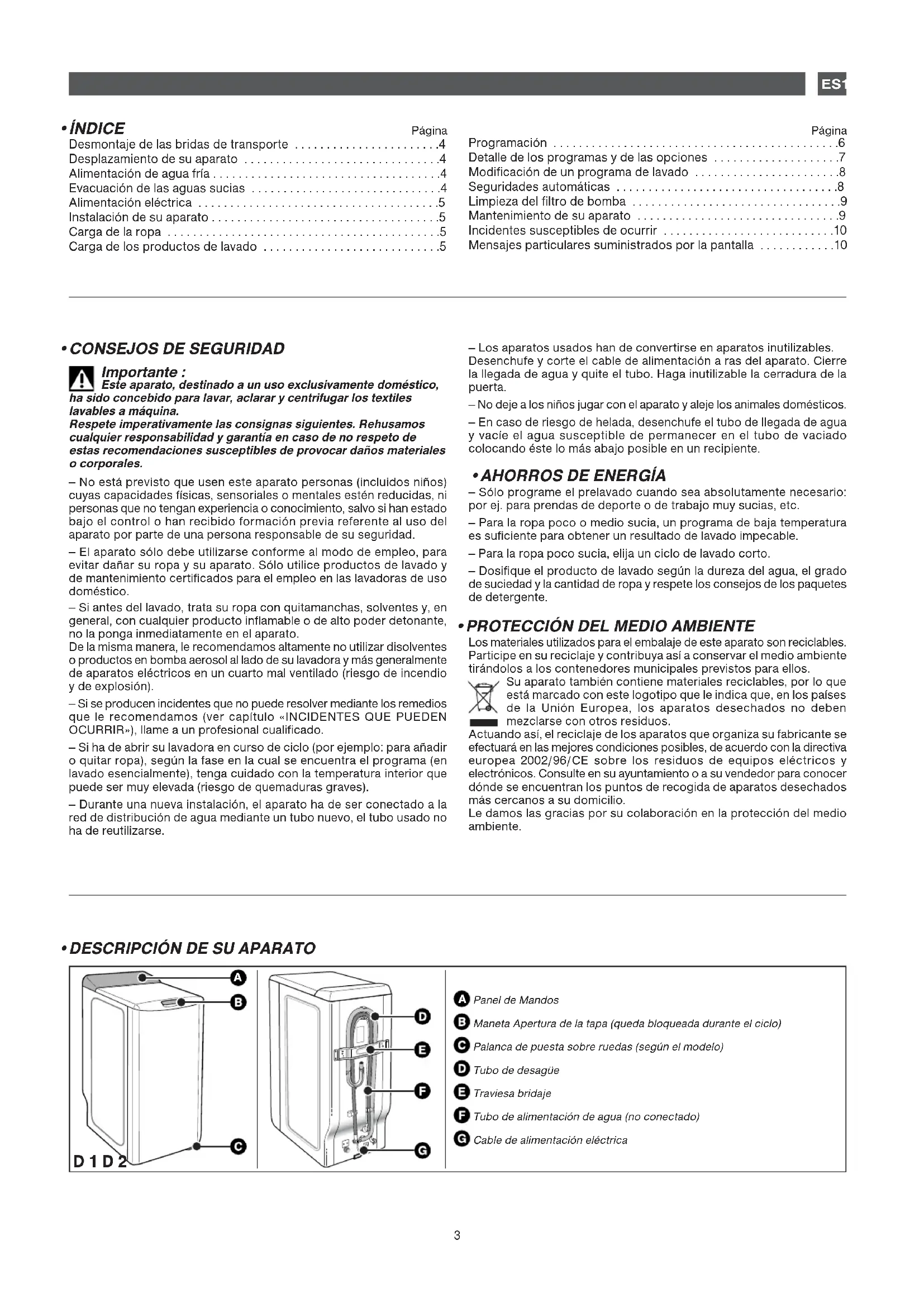 - ÍNDICE Página Desmontaje de las bridas de transporte . . . . . . . . . . . . . . . . . . . . . . .4 Desplazamiento de su aparato . . . . . . . . . . . . . . . . . . . . . . . . . . . . . . .4 Alimentación de agua fría . . . . . . . . . . . . . . . . . . . . . . . . . . . . . . . . . . . .4 Evacuación de las aguas sucias . . . . . . . . . . . . . . . . . . . . . . . . . . . . . .4 Alimentación eléctrica . . . . . . . . . . . . . . . . . . . . . . . . . . . . . . . . . . . . . .5 Instalación de su aparato . . . . . . . . . . . . . . . . . . . . . . . . . . . . . . . . . . . .5 Carga de la ropa . . . . . . . . . . . . . . . . . . . . . . . . . . . . . . . . . . . . . . . . . . .5 Carga de los productos de lavado . . . . . . . . . . . . . . . . . . . . . . . . . . . .5 Página Programación . . . . . . . . . . . . . . . . . . . . . . . . . . . . . . . . . . . . . . . . . . . . .6 Detalle de los programas y de las opciones . . . . . . . . . . . . . . . . . . . .7 Modificación de un programa de lavado . . . . . . . . . . . . . . . . . . . . . . .8 Seguridades automáticas . . . . . . . . . . . . . . . . . . . . . . . . . . . . . . . . . . .8 Limpieza del filtro de bomba . . . . . . . . . . . . . . . . . . . . . . . . . . . . . . . . .9 Mantenimiento de su aparato . . . . . . . . . . . . . . . . . . . . . . . . . . . . . . . .9 Incidentes susceptibles de ocurrir . . . . . . . . . . . . . . . . . . . . . . . . . . .10 Mensajes particulares suministrados por la pantalla . . . . . . . . . . . .10 Panel de MandosManeta Apertura de la tapa (queda bloqueada durante el ciclo)Palanca de puesta sobre ruedas (según el modelo)Tubo de desagüeTraviesa bridajeTubo de alimentación de agua (no conectado)Cable de alimentación eléctrica