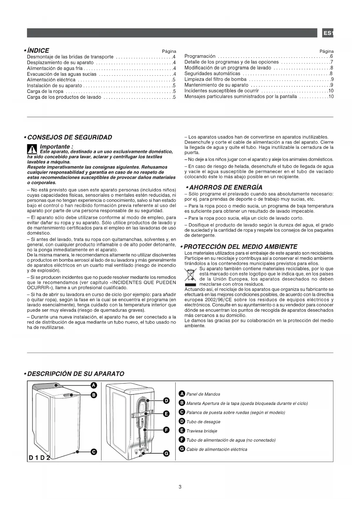 - ÍNDICE Página Desmontaje de las bridas de transporte . . . . . . . . . . . . . . . . . . . . . . .4 Desplazamiento de su aparato . . . . . . . . . . . . . . . . . . . . . . . . . . . . . . .4 Alimentación de agua fría . . . . . . . . . . . . . . . . . . . . . . . . . . . . . . . . . . . .4 Evacuación de las aguas sucias . . . . . . . . . . . . . . . . . . . . . . . . . . . . . .4 Alimentación eléctrica . . . . . . . . . . . . . . . . . . . . . . . . . . . . . . . . . . . . . .5 Instalación de su aparato . . . . . . . . . . . . . . . . . . . . . . . . . . . . . . . . . . . .5 Carga de la ropa . . . . . . . . . . . . . . . . . . . . . . . . . . . . . . . . . . . . . . . . . . .5 Carga de los productos de lavado . . . . . . . . . . . . . . . . . . . . . . . . . . . .5 Página Programación . . . . . . . . . . . . . . . . . . . . . . . . . . . . . . . . . . . . . . . . . . . . .6 Detalle de los programas y de las opciones . . . . . . . . . . . . . . . . . . . .7 Modificación de un programa de lavado . . . . . . . . . . . . . . . . . . . . . . .8 Seguridades automáticas . . . . . . . . . . . . . . . . . . . . . . . . . . . . . . . . . . .8 Limpieza del filtro de bomba . . . . . . . . . . . . . . . . . . . . . . . . . . . . . . . . .9 Mantenimiento de su aparato . . . . . . . . . . . . . . . . . . . . . . . . . . . . . . . .9 Incidentes susceptibles de ocurrir . . . . . . . . . . . . . . . . . . . . . . . . . . .10 Mensajes particulares suministrados por la pantalla . . . . . . . . . . . .10 Panel de MandosManeta Apertura de la tapa (queda bloqueada durante el ciclo)Palanca de puesta sobre ruedas (según el modelo)Tubo de desagüeTraviesa bridajeTubo de alimentación de agua (no conectado)Cable de alimentación eléctrica