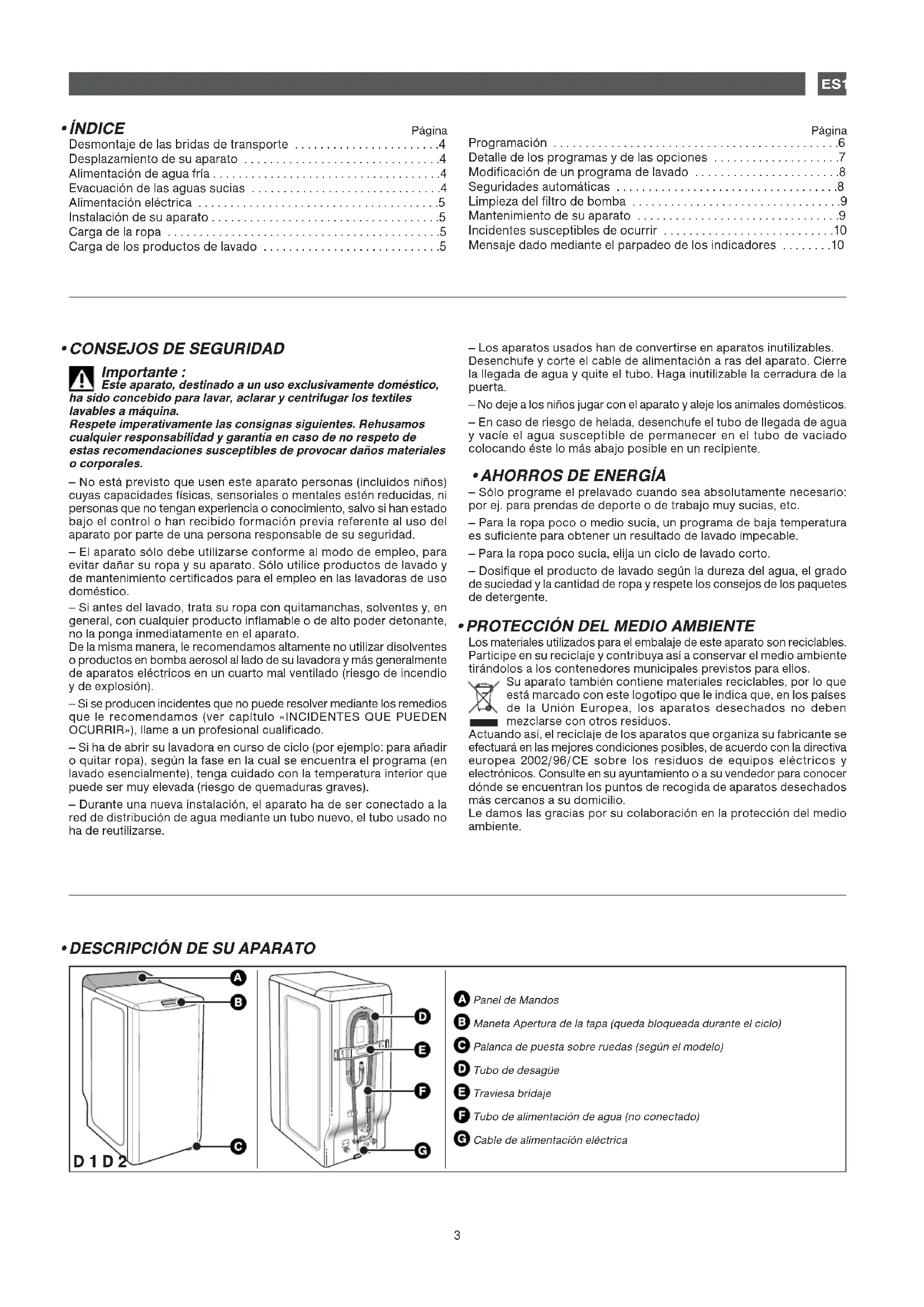 - ÍNDICE Página Desmontaje de las bridas de transporte . . . . . . . . . . . . . . . . . . . . . . .4 Desplazamiento de su aparato . . . . . . . . . . . . . . . . . . . . . . . . . . . . . . .4 Alimentación de agua fría . . . . . . . . . . . . . . . . . . . . . . . . . . . . . . . . . . . .4 Evacuación de las aguas sucias . . . . . . . . . . . . . . . . . . . . . . . . . . . . . .4 Alimentación eléctrica . . . . . . . . . . . . . . . . . . . . . . . . . . . . . . . . . . . . . .5 Instalación de su aparato . . . . . . . . . . . . . . . . . . . . . . . . . . . . . . . . . . . .5 Carga de la ropa . . . . . . . . . . . . . . . . . . . . . . . . . . . . . . . . . . . . . . . . . . .5 Carga de los productos de lavado . . . . . . . . . . . . . . . . . . . . . . . . . . . .5 Página Programación . . . . . . . . . . . . . . . . . . . . . . . . . . . . . . . . . . . . . . . . . . . . .6 Detalle de los programas y de las opciones . . . . . . . . . . . . . . . . . . . .7 Modificación de un programa de lavado . . . . . . . . . . . . . . . . . . . . . . .8 Seguridades automáticas . . . . . . . . . . . . . . . . . . . . . . . . . . . . . . . . . . .8 Limpieza del filtro de bomba . . . . . . . . . . . . . . . . . . . . . . . . . . . . . . . . .9 Mantenimiento de su aparato . . . . . . . . . . . . . . . . . . . . . . . . . . . . . . . .9 Incidentes susceptibles de ocurrir . . . . . . . . . . . . . . . . . . . . . . . . . . .10 Mensaje dado mediante el parpadeo de los indicadores . . . . . . . .10 Panel de MandosManeta Apertura de la tapa (queda bloqueada durante el ciclo)Palanca de puesta sobre ruedas (según el modelo)Tubo de desagüeTraviesa bridajeTubo de alimentación de agua (no conectado)Cable de alimentación eléctrica