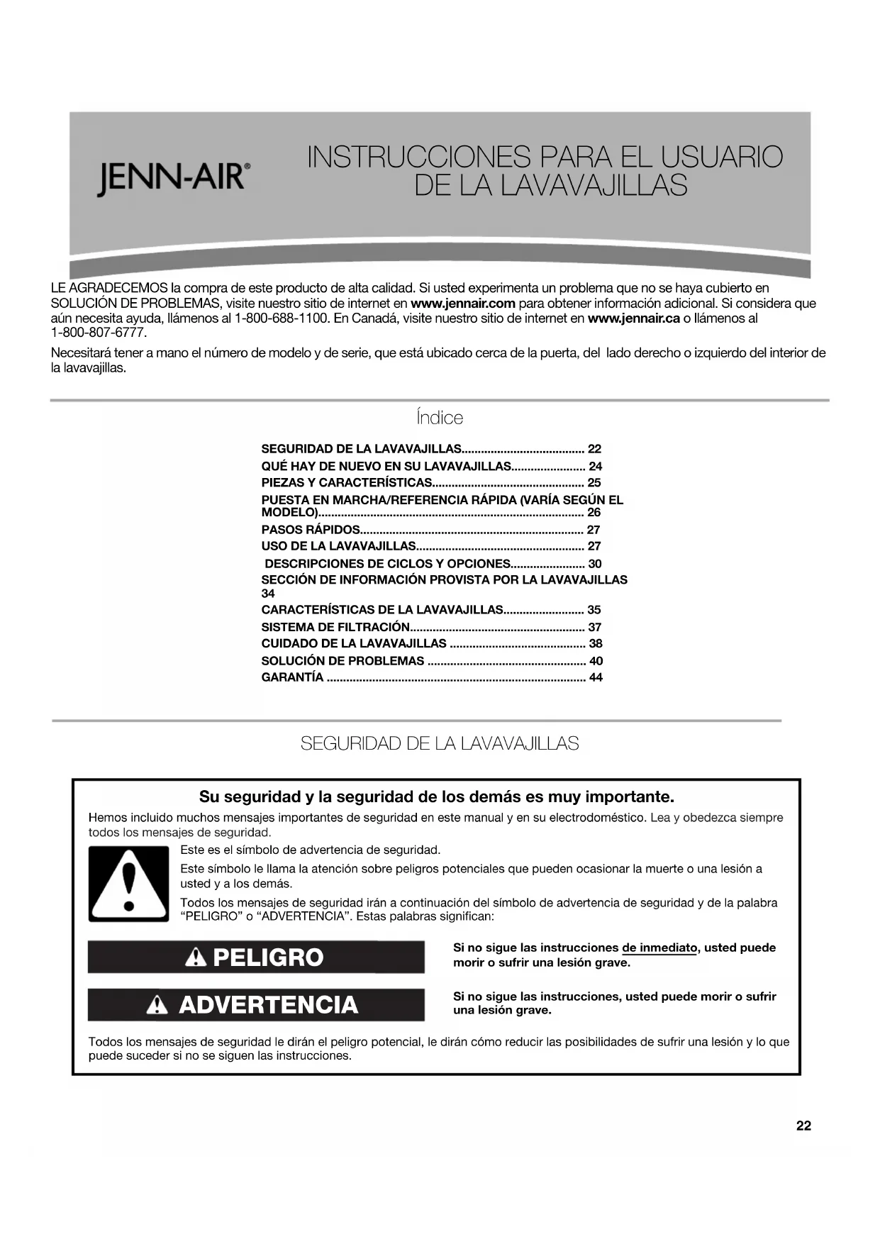 /™ ©2015 Used under license in Canada. All rights reserved.3/15Printed in U.S.A.22 LE AGRADECEMOS la compra de este producto de alta calidad. Si usted experimenta un problema que no se haya cubierto en SOLUCIÓN DE PROBLEMAS, visite nuestro sitio de internet en www.jennair.com para obtener información adicional. Si considera que aún necesita ayuda, llámenos al 1-800-688-1100. En Canadá, visite nuestro sitio de internet en www.jennair.ca o llámenos al 1-800-807-6777. Necesitará tener a mano el número de modelo y de serie, que está ubicado cerca de la puerta, del lado derecho o izquierdo del interior de la lavavajillas.