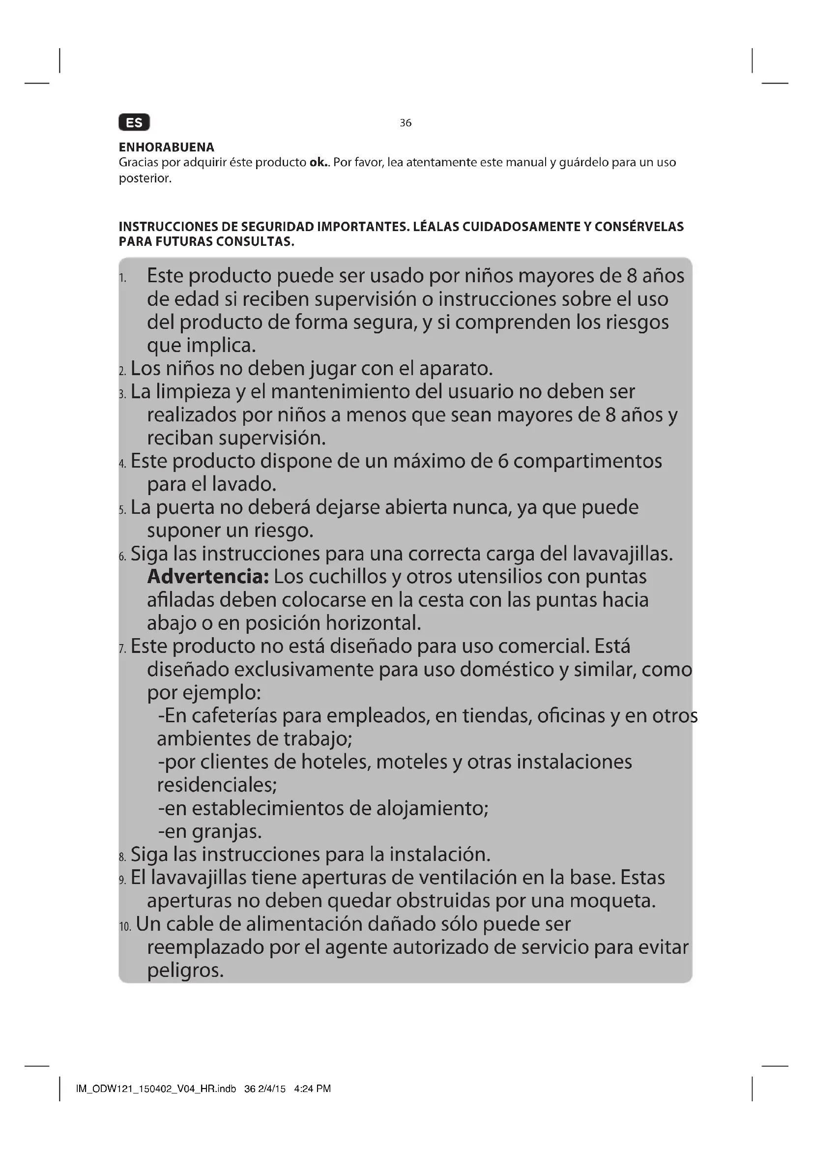 Este producto solo está destinado a lavar la vajilla y las cuberterías que sean aptas o adecuadas para el lavavajillas. Cualquier otro uso puede provocar daños en el producto o lesiones personales. Este producto está diseñado solo para uso doméstico y no está pensado para uso comercial. IM_ODW121_150402_V04_HR.indb 37 2/4/15 4:24 PM38