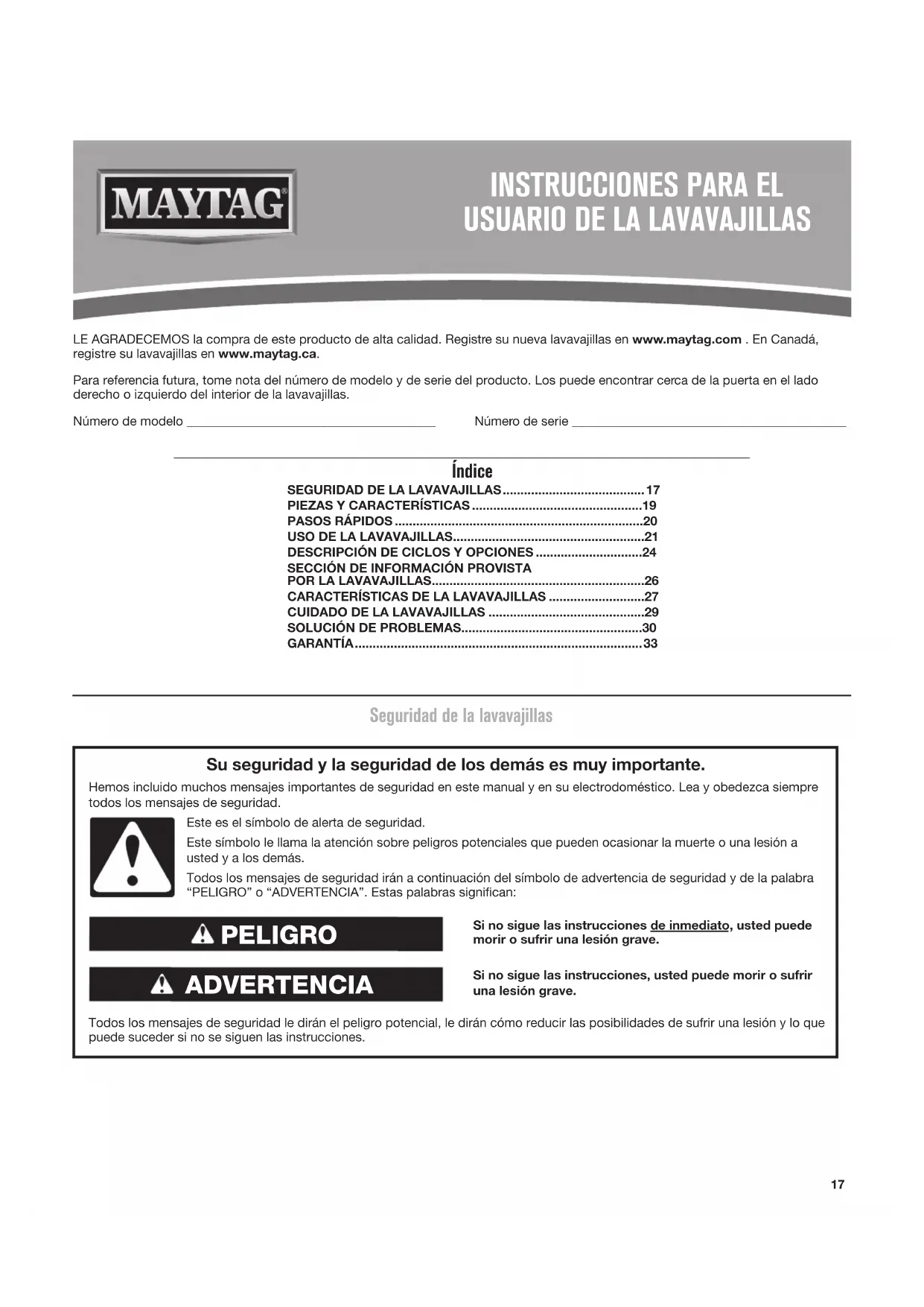 GARANTÍA ................................................................................. 33 LE AGRADECEMOS la compra de este producto de alta calidad. Registre su nueva lavavajillas en www.maytag.com . En Canadá, registre su lavavajillas en www.maytag.ca. Para referencia futura, tome nota del número de modelo y de serie del producto. Los puede encontrar cerca de la puerta en el lado derecho o izquierdo del interior de la lavavajillas. Número de modelo _______________________________________ Número de serie ___________________________________________ Seguridad de la lavavajillas Si no sigue las instrucciones de inmediato, usted puede morir o sufrir una lesión grave. Si no sigue las instrucciones, usted puede morir o sufrir una lesión grave. Todos los mensajes de seguridad le dirán el peligro potencial, le dirán cómo reducir las posibilidades de sufrir una lesión y lo que puede suceder si no se siguen las instrucciones. Su seguridad y la seguridad de los demás es muy importante. Hemos incluido muchos mensajes importantes de seguridad en este manual y en su electrodoméstico. Lea y obedezca siempre todos los mensajes de seguridad. ADVERTENCIA PELIGRO Este es el símbolo de alerta de seguridad. Este símbolo le llama la atención sobre peligros potenciales que pueden ocasionar la muerte o una lesión a usted y a los demás. Todos los mensajes de seguridad irán a continuación del símbolo de advertencia de seguridad y de la palabra “PELIGRO” o “ADVERTENCIA”. Estas palabras significan:18