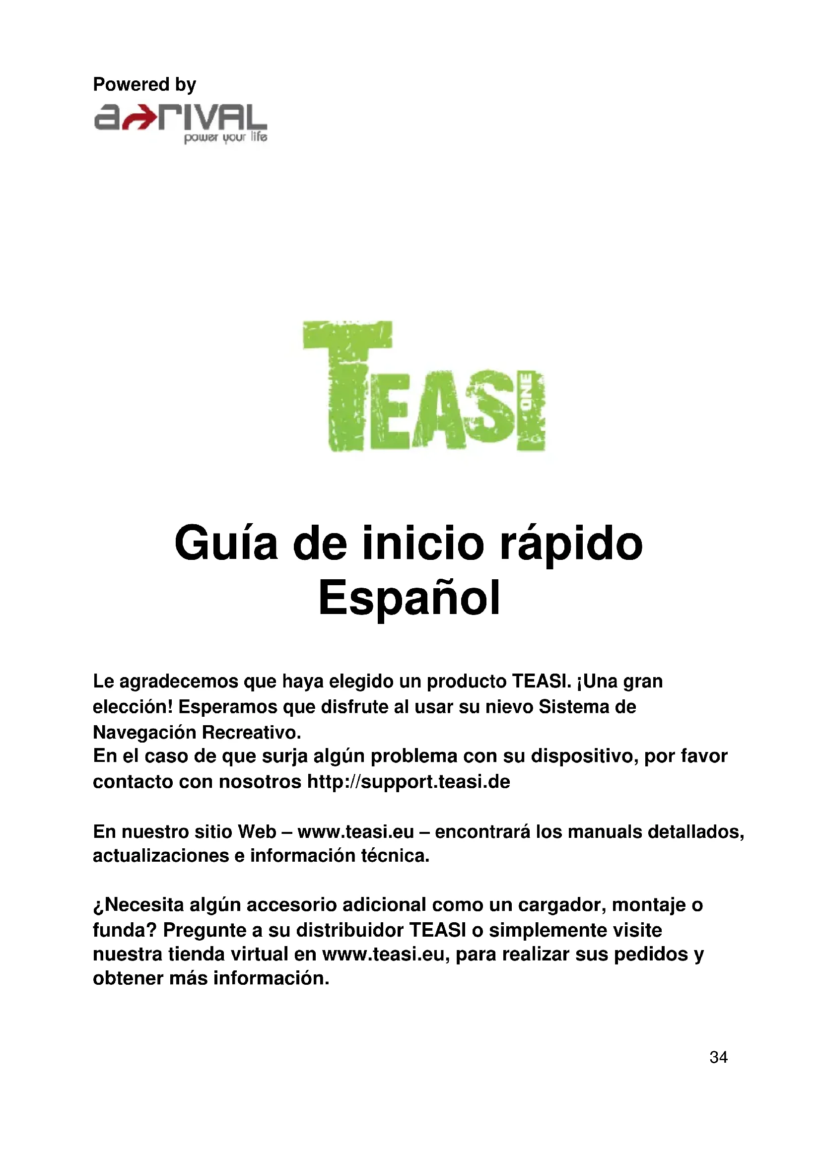 Le agradecemos que haya elegido un producto TEASI. ¡Una gran elección! Esperamos que disfrute al usar su nievo Sistema de Navegación Recreativo. En el caso de que surja algún problema con su dispositivo, por favor contacto con nosotros http://support.teasi.de En nuestro sitio Web – www.teasi.eu – encontrará los manuals detallados, actualizaciones e información técnica. ¿Necesita algún accesorio adicional como un cargador, montaje o funda? Pregunte a su distribuidor TEASI o simplemente visite nuestra tienda virtual en www.teasi.eu, para realizar sus pedidos y obtener más información.35 Uso y funcionamiento de sistemas de navegación ¡Atención! No realice operaciones en el dispositivo mientras está conduciendo. Incluso las distracciones más pequeñas desatendiendo la carretera o el tráfico por su parte o por parte de otros conductores – incluso a bajas velocidades – pueden tener consecuencias devastadoras. Introduzca el destino antes de iniciar su viaje y encienda su sistema de navegación antes de empezar a conducir. Si tiene que cambiar la ruta o ajustar los parámetros mientras conduce, es mejor que pare para hacerlo. Después de encender el dispositivo, este puede tardar un rato en encontrar el mínimo número necesario de satélites de navegación. Dependiendo del entorno, puede tardar más o menos. A cielo abierto, será más rápido. En los centros de las ciudades con calles estrechas y edificios altos, este proceso puede tardar más, ya que la vista del cielo es muy estrecha y esto provoca reflejos de las señales de los satélites. En el interior de un bosque también puede tardar más debido a las copas de los árboles. En el interior de túneles, edificios, etc. ¡el sistema no funciona! Tan pronto como se encuentre en cielo abierto se establecerá la conexión con los satélites tan pronto como sea posible. Los datos de los mapas están actualizados a la fecha de la producción de su sistema de navegación. Sin embargo, puede ocurrir que calles, rutas, números de casas, glorietas, etc. conocidos desde hace tiempo no estén incluidos. Esto no es un error, sino que se debe al hecho de que las calles van cambiando. Su dispositivo usa un Mapa Callejero Abierto (OSM, siglas en inglés). Este es en nuestra opinión el mapa más útil para los ciclistas. El OSM es un proyecto colaborativo basado en Internet sin ánimo de lucro para crear un mapa del mundo gratuito. A nosotros nos gusta esta idea y la apoyamos.