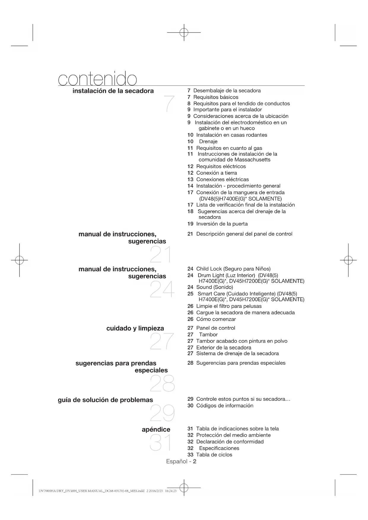 - Para obtener los mejores resultados, siga las recomendaciones sobre el tamaño de la carga para cada ciclo de secado. apéndice DV7000HA DRY_DV48H_USER MANUAL_DC68-03170J-08_MES.indd 34 2016/2/25 16:24:30Español - 35
