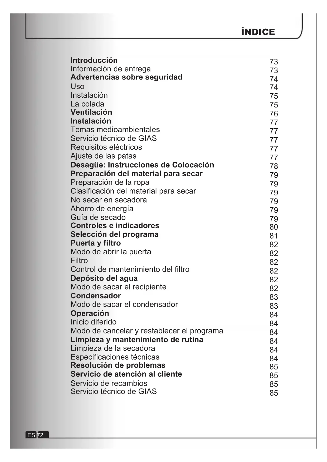 : Installare e utilizzare il tubo di scarico per scaricare acqua condensata. Informazıonı per Test dı Laboratorıo EN 61121 Programmı Programmı da usare -Cotone Asciutto-Asciutto No-Stiro -Asciutto Pronto-Stiro - +SiAsciutto No-Stiro ntetico -Cotone Asciutto da Stirare -Tessuti DelicatiÍNDICE ES 72 Introducción Información de entrega Advertencias sobre seguridad Uso Instalación La colada Ventilación Instalación Temas medioambientales Servicio técnico de GIAS Requisitos eléctricos Ajuste de las patas Desagüe: Instrucciones de Colocación Preparación del material para secar Preparación de la ropa Clasificación del material para secar No secar en secadora Ahorro de energía Guía de secado Controles e indicadores Selección del programa Puerta y filtro Modo de abrir la puerta Filtro Control de mantenimiento del filtro Depósito del agua Modo de sacar el recipiente Condensador Modo de sacar el condensador Operación Inicio diferido Modo de cancelar y restablecer el programa Limpieza y mantenimiento de rutina Limpieza de la secadora Especificaciones técnicas Resolución de problemas Servicio de atención al cliente Servicio de recambios Servicio técnico de GIAS