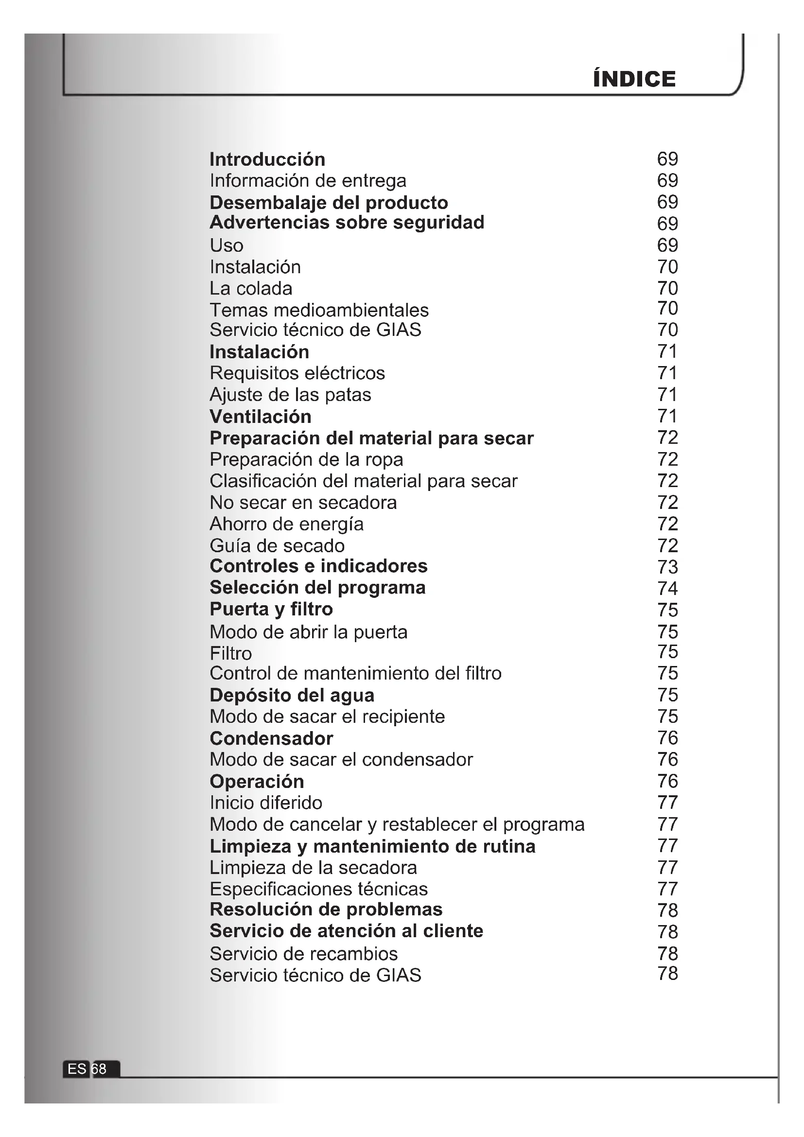 Introducción Información de entrega Desembalaje del producto Advertencias sobre seguridad Uso Instalación La colada Temas medioambientales Servicio técnico de GIAS Instalación Requisitos eléctricos Ajuste de las patas Ventilación Preparación del material para secar Preparación de la ropa Clasificación del material para secar No secar en secadora Ahorro de energía Guía de secado Controles e indicadores Selección del programa Puerta y filtro Modo de abrir la puerta Filtro Control de mantenimiento del filtro Depósito del agua Modo de sacar el recipiente Condensador Modo de sacar el condensador Operación Inicio diferido Modo de cancelar y restablecer el programa Limpieza y mantenimiento de rutina Limpieza de la secadora Especificaciones técnicas Resolución de problemas Servicio de atención al cliente Servicio de recambios Servicio técnico de GIAS ÍNDICEINTRODUCCIÓN Por favor verifique que los siguientes artículos hayan sido entregados con el electrodoméstico: ● Manual de instrucciones ● Tarjeta de garantía ● Etiqueta de energía Desembale la secadora en un lugar cercano al de su instalación definitiva.