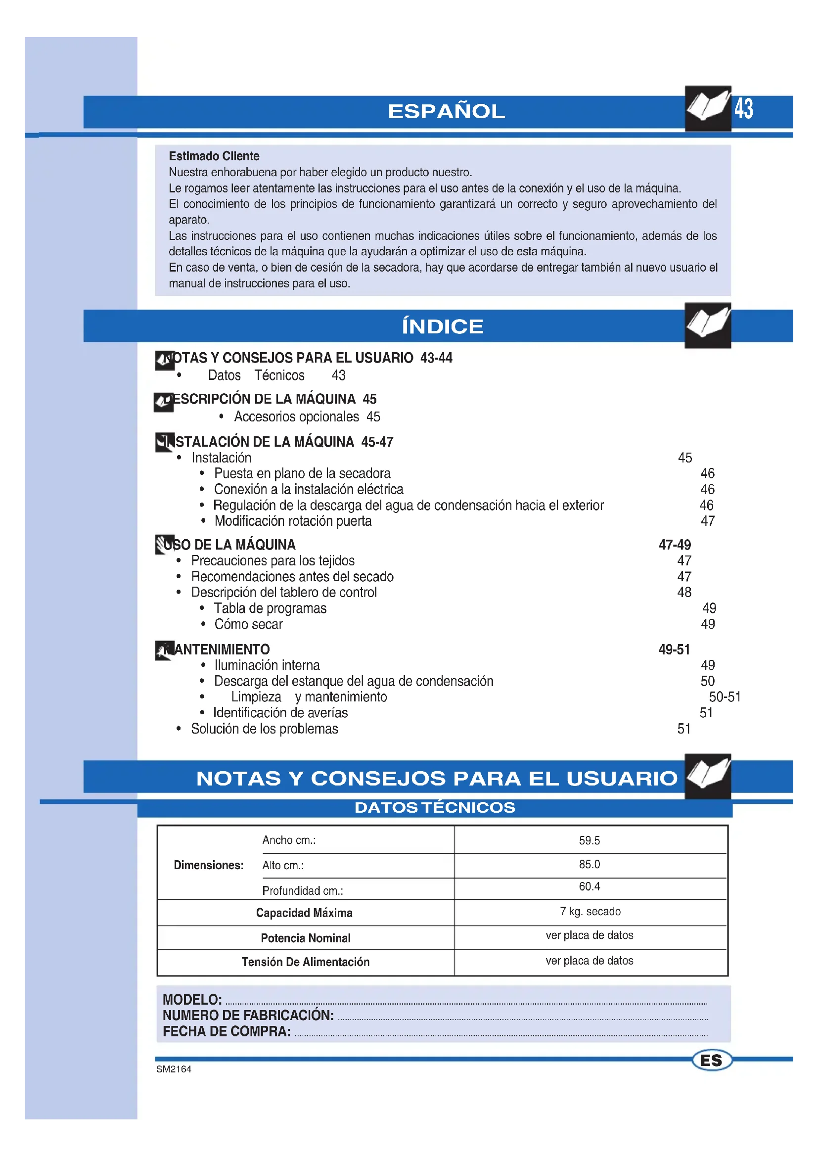 ÍNDICE MODELO: ........................................................................................................................................................................................................... NUMERO DE FABRICACIÓN: ............................................................................................................................................................ FECHA DE COMPRA: .............................................................................................................................................................................. ESPAÑOL Estimado Cliente Nuestra enhorabuena por haber elegido un producto nuestro. Le rogamos leer atentamente las instrucciones para el uso antes de la conexión y el uso de la máquina. El conocimiento de los principios de funcionamiento garantizará un correcto y seguro aprovechamiento del aparato. Las instrucciones para el uso contienen muchas indicaciones útiles sobre el funcionamiento, además de los detalles técnicos de la máquina que la ayudarán a optimizar el uso de esta máquina. En caso de venta, o bien de cesión de la secadora, hay que acordarse de entregar también al nuevo usuario el manual de instrucciones para el uso. NOTAS Y CONSEJOS PARA EL USUARIO 43-44