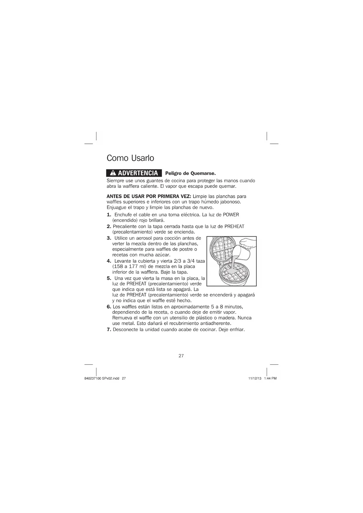 (precalentamiento) Verde Partes y Características 840237100 SPv02.indd 26840237100 SPv02.indd 26 11/12/13 1:44 PM11/12/13 1:44 PM27 Como Usarlo ANTES DE USAR POR PRIMERA VEZ: Limpie las planchas para waffles superiores e inferiores con un trapo húmedo jabonoso. Enjuague el trapo y limpie las planchas de nuevo.