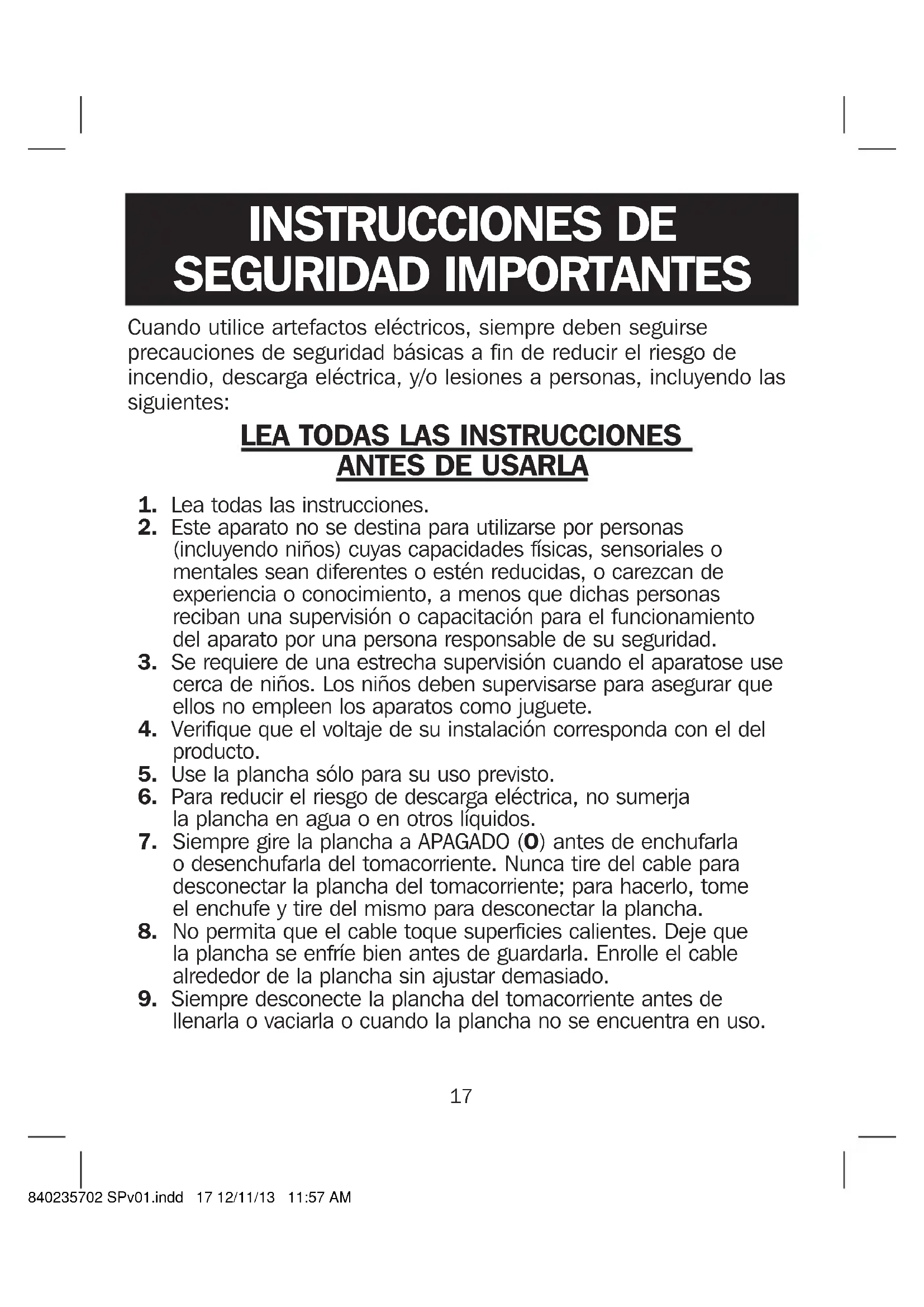 llenarla o vaciarla o cuando la plancha no se encuentra en uso. INSTRUCCIONES DE SEGURIDAD IMPORTANTES 840235702 SPv01.indd 17 12/11/13 11:57 AM18