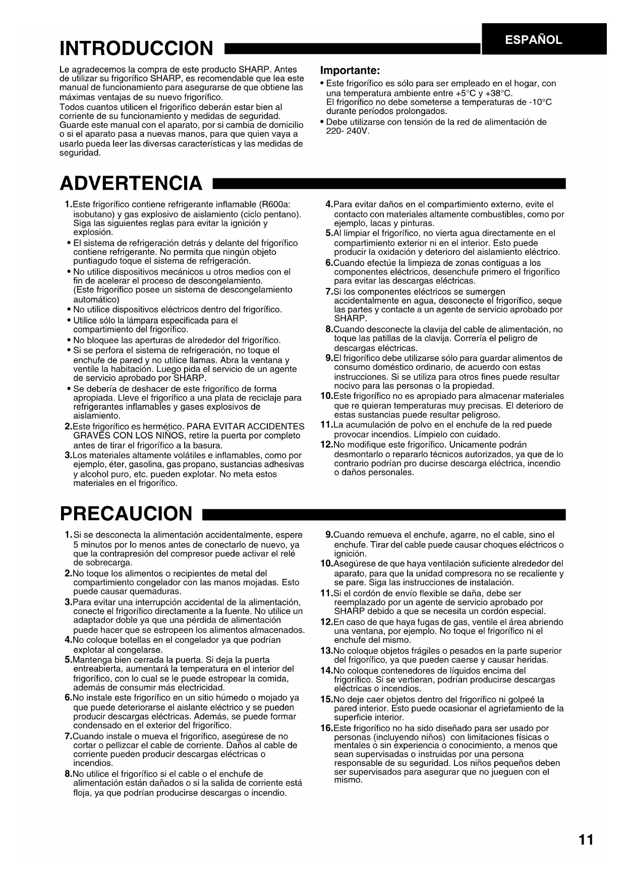 OUT (A711)3‑10ENG1.fmPage10Saturday,March25,20065:39PM11 POLSKI MAGYAR ROMÂNÃ ČESKY SLOVENSKY LIETUVIŲ KALBA LATVIAN EESTI KEEL SLOVENSKO ESPAÑOL INTRODUCCION Le agradecemos la compra de este producto SHARP. Antes de utilizar su frigorífico SHARP, es recomendable que lea este manual de funcionamiento para asegurarse de que obtiene las máximas ventajas de su nuevo frigorífico.Todos cuantos utilicen el frigorífico deberán estar bien al corriente de su funcionamiento y medidas de seguridad. Guarde este manual con el aparato, por si cambia de domicilio o si el aparato pasa a nuevas manos, para que quien vaya a usarlo pueda leer las diversas características y las medidas de seguridad. Importante:
