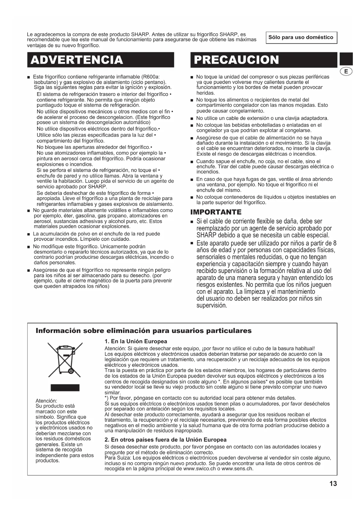 Refer to your nearest service agent approved by SHARP. (B504)-W.indb 12 2013/11/01 12:26:2413 Sólo para uso doméstico Le agradecemos la compra de este producto SHARP. Antes de utilizar su frigoríco SHARP, es recomendable que lea este manual de funcionamiento para asegurarse de que obtiene las máximas ventajas de su nuevo frigoríco. ■ Este frigoríco contiene refrigerante inamable (R600a: isobutano) y gas explosivo de aislamiento (ciclo pentano). Siga las siguientes reglas para evitar la ignición y explosión. El sistema de refrigeración trasero e interior del frigoríco • contiene refrigerante. No permita que ningún objeto puntiagudo toque el sistema de refrigeración. No utilice dispositivos mecánicos u otros medios con el n • de acelerar el proceso de descongelacion. (Este frigoríco posee un sistema de descongelacion automático) No utilice dispositivos eléctricos dentro del frigoríco.• Utilice sólo las piezas especicadas para la luz del • compartimiento del frigoríco. No bloquee las aperturas alrededor del frigoríco.• No use atomizadores inamables, como por ejemplo la • pintura en aerosol cerca del frigoríco. Podría ocasionar explosiones o incendios. Si se perfora el sistema de refrigeración, no toque el • enchufe de pared y no utilice llamas. Abra la ventana y ventile la habitación. Luego pida el servicio de un agente de servicio aprobado por SHARP. Se debería deshechar de este frigoríco de forma • apropiada. Lleve el frigoríco a una planta de reciclaje para refrigerantes inamables y gases explosivos de aislamiento. ■ No guarde materiales altamente volátiles e inamables como por ejemplo, éter, gasolina, gas propano, atomizadores en aerosol, sustancias adhesivas y alcohol puro, etc. Estos materiales pueden ocasionar explosiones. ■ La acumulación de polvo en el enchufe de la red puede provocar incendios. Límpielo con cuidado. ■ No modique este frigoríco. Unicamente podrán desmontarlo o repararlo técnicos autorizados, ya que de lo contrario podrían producirse descargas eléctricas, incendio o daños personales. ■ Asegúrese de que el frigoríco no represente ningún peligro para los niños al ser almacenado para su desecho. (por ejemplo, quite el cierre magnético de la puerta para prevenir que queden atrapados los niños) ADVERTENCIA PRECAUCION ■ No toque la unidad del compresor o sus piezas periféricas ya que pueden volverse muy calientes durante el funcionamiento y los bordes de metal pueden provocar heridas. ■ No toque los alimentos o recipientes de metal del compartimiento congelador con las manos mojadas. Esto puede causar congelamiento. ■ No utilice un cable de extensión o una clavija adaptadora. ■ No coloque las bebidas enbotelladas o enlatadas en el congelador ya que podrían explotar al congelarse. ■ Asegúrese de que el cable de alimentación no se haya dañado durante la instalación o el movimiento. Si la clavija o el cable se encuentran deteriorados, no inserte la clavija. Existe el riesgo de descargas eléctricas o incendios. ■ Cuando sapue el enchufe, no coja, no el cable, sino el enchufe. Tirar del cable puede causar descargas eléctrica o incendios. ■ En caso de que haya fugas de gas, ventile el área abriendo una ventana, por ejemplo. No toque el frigoríco ni el enchufe del mismo. ■ No coloque contenederos de líquidos u objetos inestables en la parte superior del frigoríco. IMPORTANTE