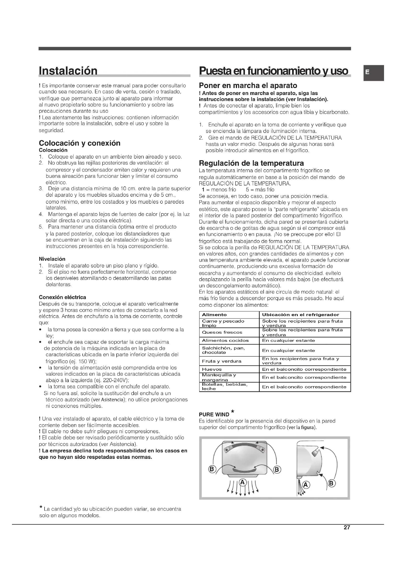 - elenchufeseacapazdesoportarlacargamáxima depotenciadelamáquinaindicadaenlaplacadecaracterísticasubicadaenlaparteinferiorizquierdadelfrigorífico(ej.150W);• latensióndealimentaciónestécomprendidaentrelosvaloresindicadosenlaplacadecaracterísticasubicadaabajoalaizquierda(ej.220-240V);• latomaseacompatibleconelenchufedelaparato. Sinofueraasí,solicitelasustitucióndelenchufeauntécnicoautorizado(ver Asistencia);noutiliceprolongacionesniconexionesmúltiples.!Unavezinstaladoelaparato,elcableeléctricoylatomadecorrientedebenserfácilmenteaccesibles.!Elcablenodebesufrirplieguesnicompresiones.!Elcabledebeserrevisadoperiódicamenteysustituidosóloportécnicosautorizados(verAsistencia).! La empresa declina toda responsabilidad en los casos en que no hayan sido respetadas estas normas. Puesta en funcionamiento y uso Poner en marcha el aparato ! Antes de poner en marcha el aparato, siga las instrucciones sobre la instalación (ver Instalación).!Antesdeconectarelaparato,limpiebienloscompartimientosylosaccesoriosconaguatibiaybicarbonato.1. Enchufeelaparatoenlatomadecorrienteyverifiquequeseenciendalalámparadeiluminacióninterna.2. GireelmandodeREGULACIÓNDELATEMPERATURAhastaunvalormedio.Despuésdealgunashorasseráposibleintroduciralimentosenelfrigorífico. Regulación de la temperatura LatemperaturainternadelcompartimentofrigoríficoseregulaautomáticamenteenbasealaposicióndelmandodeREGULACIÓNDELATEMPERATURA. 1=menosfrío 5=másfríoSeaconseja,entodocaso,ponerunaposiciónmedia.Paraaumentarelespaciodisponibleymejorarelaspectoestético,esteaparatoposeela“parterefrigerante”ubicadaenelinteriordelaparedposteriordelcompartimentofrigorífico.Duranteelfuncionamiento,dichaparedsepresentarácubiertadeescarchaodegotitasdeaguasegúnsielcompresorestáenfuncionamientooenpausa.¡Nosepreocupeporello!Elfrigoríficoestátrabajandodeformanormal.SisecolocalaperilladeREGULACIÓNDELATEMPERATURAenvaloresaltos,congrandescantidadesdealimentosyconunatemperaturaambienteelevada,elaparatopuedefuncionarcontinuamente,produciendounaexcesivaformacióndeescarchayaumentandoelconsumodeelectricidad.evítelodesplazandolaperillahaciavaloresmásbajos(seefectuaráundescongelamientoautomático).Enlosaparatosestáticoselairecirculademodonatural:elmásfríotiendeadescenderporqueesmáspesado.Heaquícomodisponerlosalimentos: Alimento Ubicación en el refrigerador Carne y pescado limpio Sobre los recipientes para fruta y verdura Quesos frescos Sobre los recipientes para fruta y verdura Alimentos cocidos En cualquier estante Salchichón, pan, chocolate En cualquier estante Fruta y verdura En los recipientes para fruta y verdura Huevos En el balconcito correspondiente Mantequilla y margarina En el balconcito correspondiente Botellas, bebidas, leche En el balconcito correspondiente PURE WIND *Esidentificableporlapresenciadeldispositivoenlaparedsuperiordelcompartimentofrigorífico(ver la gura).