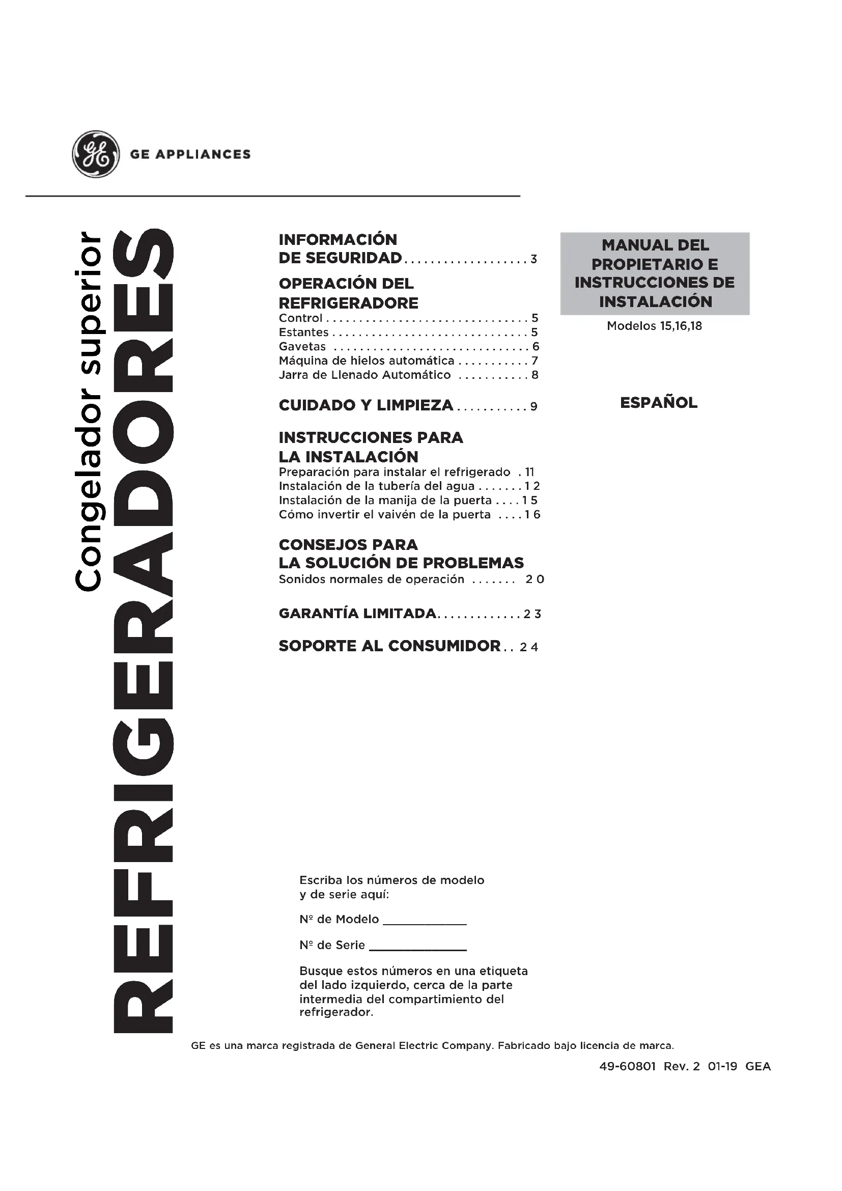 49-60801 Rev. 2 01-19 GEA Modelos 15,16,18 REFRIGERADORES Congelador superior ESPAÑOL MANUAL DEL PROPIETARIO E INSTRUCCIONES DE INSTALACIÓN Escriba los números de modelo y de serie aquí: Nº de Modelo ____________ Nº de Serie ______________ Busque estos números en una etiqueta del lado izquierdo, cerca de la parte intermedia del compartimiento del refrigerador. GE es una marca registrada de General Electric Company. Fabricado bajo licencia de marca.2 49-60801 Rev. 2 GRACIAS POR HACER QUE GE APPLIANCES SEA PARTE DE SU HOGAR. Ya sea que haya crecido usando GE Appliances, o que ésta es su primera vez, nos complace tenerlo en la familia. Sentimos orgullo por el nivel de arte, innovación y diseño de cada uno de los electrodomésticos de GE Appliances, y creemos que usted también. Entre otras cosas, el registro de su electrodoméstico asegura que podamos entregarle información importante del producto y detalles de la garantía cuando los necesite. Registre su electrodoméstico GE ahora a través de Internet. Sitios Web y números telefónicos útiles están disponibles en la sección de Soporte para el Consumidor de este Manual del Propietario. También puede enviar una carta en la tarjeta de inscripción preimpresa que se incluye con el material embalado.49-60801 Rev. 2 3