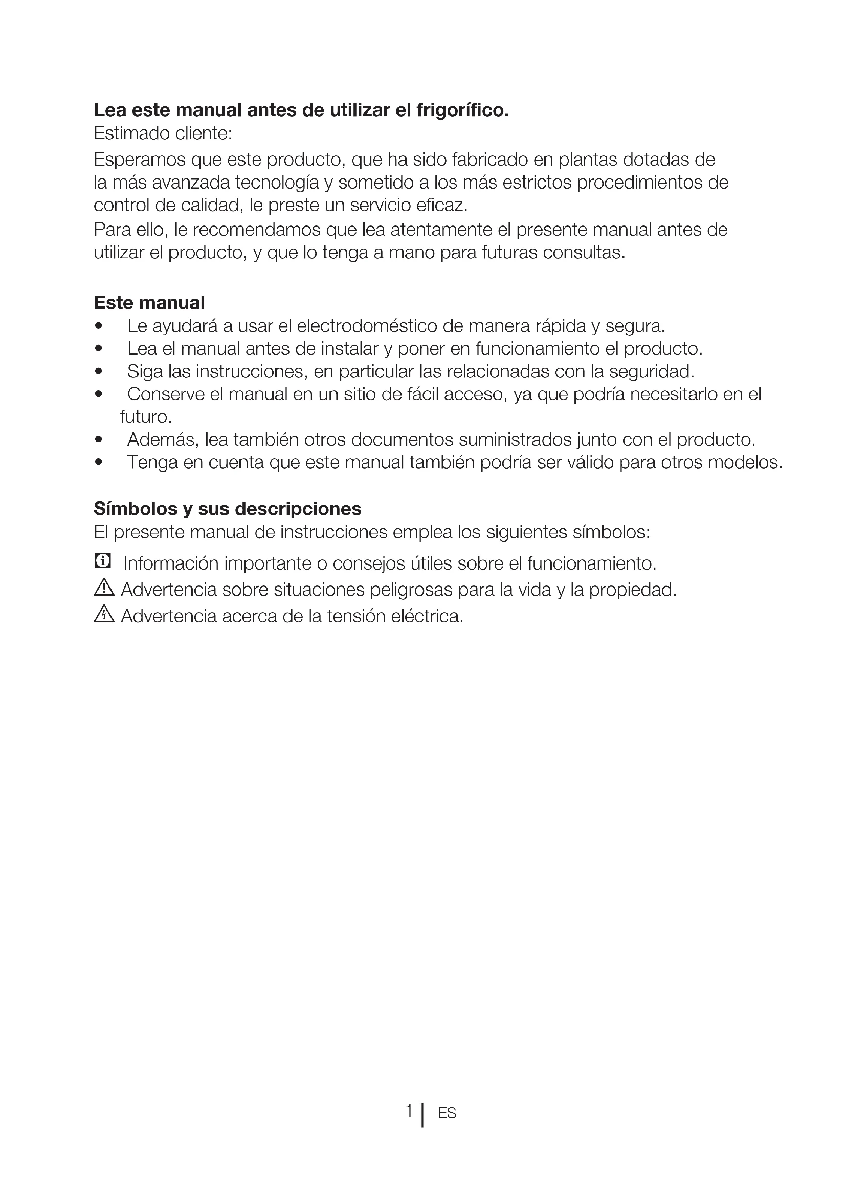 Lea este manual antes de utilizar el frigorífico. Estimado cliente: Esperamos que este producto, que ha sido fabricado en plantas dotadas de la más avanzada tecnología y sometido a los más estrictos procedimientos de control de calidad, le preste un servicio eficaz. Para ello, le recomendamos que lea atentamente el presente manual antes de utilizar el producto, y que lo tenga a mano para futuras consultas. Este manual