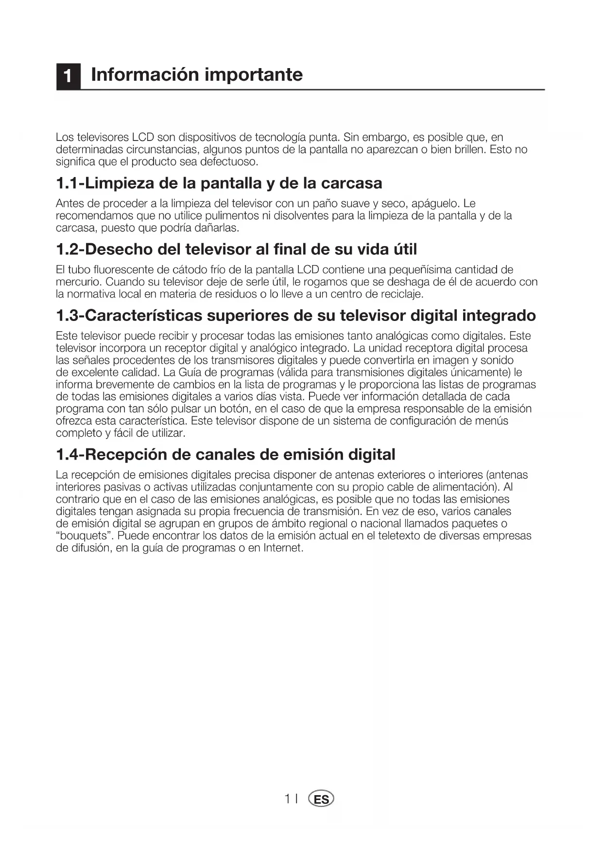 Los televisores LCD son dispositivos de tecnología punta. Sin embargo, es posible que, en determinadas circunstancias, algunos puntos de la pantalla no aparezcan o bien brillen. Esto no significa que el producto sea defectuoso. 1.1-Limpieza de la pantalla y de la carcasa Antes de proceder a la limpieza del televisor con un paño suave y seco, apáguelo. Le recomendamos que no utilice pulimentos ni disolventes para la limpieza de la pantalla y de la carcasa, puesto que podría dañarlas. 1.2-Desecho del televisor al final de su vida útil El tubo fluorescente de cátodo frío de la pantalla LCD contiene una pequeñísima cantidad de mercurio. Cuando su televisor deje de serle útil, le rogamos que se deshaga de él de acuerdo con la normativa local en materia de residuos o lo lleve a un centro de reciclaje. 1.3-Características superiores de su televisor digital integrado Este televisor puede recibir y procesar todas las emisiones tanto analógicas como digitales. Este televisor incorpora un receptor digital y analógico integrado. La unidad receptora digital procesa las señales procedentes de los transmisores digitales y puede convertirla en imagen y sonido de excelente calidad. La Guía de programas (válida para transmisiones digitales únicamente) le informa brevemente de cambios en la lista de programas y le proporciona las listas de programas de todas las emisiones digitales a varios días vista. Puede ver información detallada de cada programa con tan sólo pulsar un botón, en el caso de que la empresa responsable de la emisión ofrezca esta característica. Este televisor dispone de un sistema de configuración de menús completo y fácil de utilizar. 1.4-Recepción de canales de emisión digital La recepción de emisiones digitales precisa disponer de antenas exteriores o interiores (antenas interiores pasivas o activas utilizadas conjuntamente con su propio cable de alimentación). Al contrario que en el caso de las emisiones analógicas, es posible que no todas las emisiones digitales tengan asignada su propia frecuencia de transmisión. En vez de eso, varios canales de emisión digital se agrupan en grupos de ámbito regional o nacional llamados paquetes o “bouquets”. Puede encontrar los datos de la emisión actual en el teletexto de diversas empresas de difusión, en la guía de programas o en Internet.