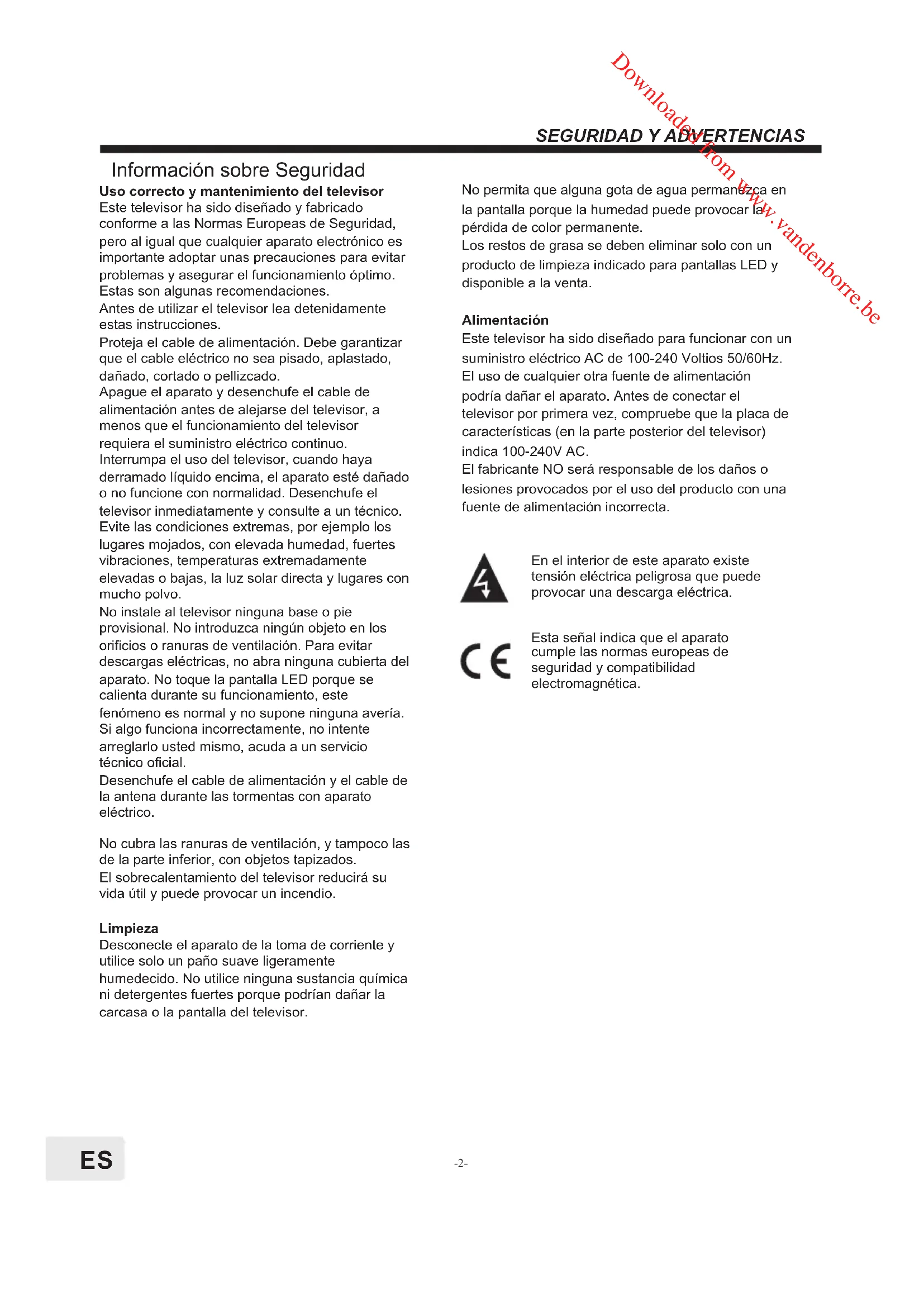 Información sobre Seguridad En el interior de este aparato existe tensión eléctrica peligrosa que puede provocar una descarga eléctrica. Esta señal indica que el aparato cumple las normas europeas de seguridad y compatibilidad electromagnética. Uso correcto y mantenimiento del televisor Este televisor ha sido diseñado y fabricado conforme a las Normas Europeas de Seguridad, pero al igual que cualquier aparato electrónico es importante adoptar unas precauciones para evitar problemas y asegurar el funcionamiento óptimo. Estas son algunas recomendaciones. Antes de utilizar el televisor lea detenidamente estas instrucciones. Proteja el cable de alimentación. Debe garantizar que el cable eléctrico no sea pisado, aplastado, dañado, cortado o pellizcado. Apague el aparato y desenchufe el cable de alimentación antes de alejarse del televisor, a menos que el funcionamiento del televisor requiera el suministro eléctrico continuo. Interrumpa el uso del televisor, cuando haya derramado líquido encima, el aparato esté dañado o no funcione con normalidad. Desenchufe el televisor inmediatamente y consulte a un técnico. Evite las condiciones extremas, por ejemplo los lugares mojados, con elevada humedad, fuertes vibraciones, temperaturas extremadamente elevadas o bajas, la luz solar directa y lugares con mucho polvo. No instale al televisor ninguna base o pie provisional. No introduzca ningún objeto en los orificios o ranuras de ventilación. Para evitar descargas eléctricas, no abra ninguna cubierta del aparato. No toque la pantalla LED porque se calienta durante su funcionamiento, este fenómeno es normal y no supone ninguna avería. Si algo funciona incorrectamente, no intente arreglarlo usted mismo, acuda a un servicio técnico oficial. Desenchufe el cable de alimentación y el cable de la antena durante las tormentas con aparato eléctrico. No cubra las ranuras de ventilación, y tampoco las de la parte inferior, con objetos tapizados. El sobrecalentamiento del televisor reducirá su vida útil y puede provocar un incendio. Limpieza Desconecte el aparato de la toma de corriente y utilice solo un paño suave ligeramente humedecido. No utilice ninguna sustancia química ni detergentes fuertes porque podrían dañar la carcasa o la pantalla del televisor. No permita que alguna gota de agua permanezca en la pantalla porque la humedad puede provocar la pérdida de color permanente. Los restos de grasa se deben eliminar solo con un producto de limpieza indicado para pantallas LED y disponible a la venta. Alimentación Este televisor ha sido diseñado para funcionar con un suministro eléctrico AC de 100-240 Voltios 50/60Hz. El uso de cualquier otra fuente de alimentación podría dañar el aparato. Antes de conectar el televisor por primera vez, compruebe que la placa de características (en la parte posterior del televisor) indica 100-240V AC. El fabricante NO será responsable de los daños o lesiones provocados por el uso del producto con una fuente de alimentación incorrecta.