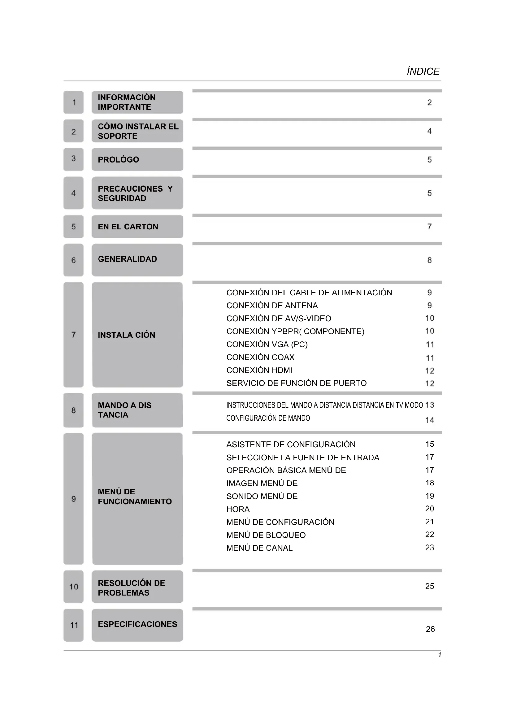 Ponga el TV en una superficie estable. No ponga ningún material arriba del TV. No utilice el televisor con los accesorios distintos de los suministrados o sugeridos por el fabricante. No cubren los orificios de ventilación del televisor. Si tiene un soporte de anclaje a la pared, compruebe que es estable. Cable de alimentación y cable de conexción deben ser correctamente colocados y protegidos para evitar que las personas tropezen con ellos y se produzca el vuelco del TV.PRECAUCIONES Y SEGURIDAD Mantega el TV seco y lejos de la humedad. Mantenga el TV lejos de un calentador. Desenchufe el TV antes de limpiarlo. No utilice el solvente O líquido para limpiarlo. Sólo limpie el TV con un paño seco y limpio. En caso de solución de problemas, no utilice las piezas de respuestos que no sean sugeridas por el fabricante. Utilizando las piezas de respuestos no adecuadas pueden dar lugar a descargas eléctricas, cortos circuitos, incendio u otros accidentes. Desenchufe el TV durante las tormentas eléctricas o cuando no lo utiliza durante largos períodos de tiempo.LCD TV SET Mando a distancia Pila AAA Cable de alimentación Manual de usuario Guía de conexión rápida Tarjeta de garantía
