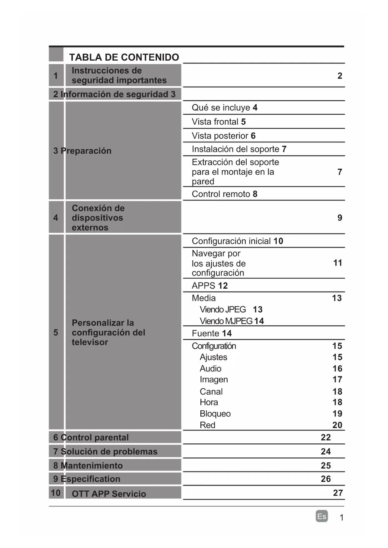 2 Información de seguridad 3 3 Preparación Qué se incluye 4 Vista frontal 5 Vista posterior 6 Instalación del soporte 7 Extracción del soporte para el montaje en la pared